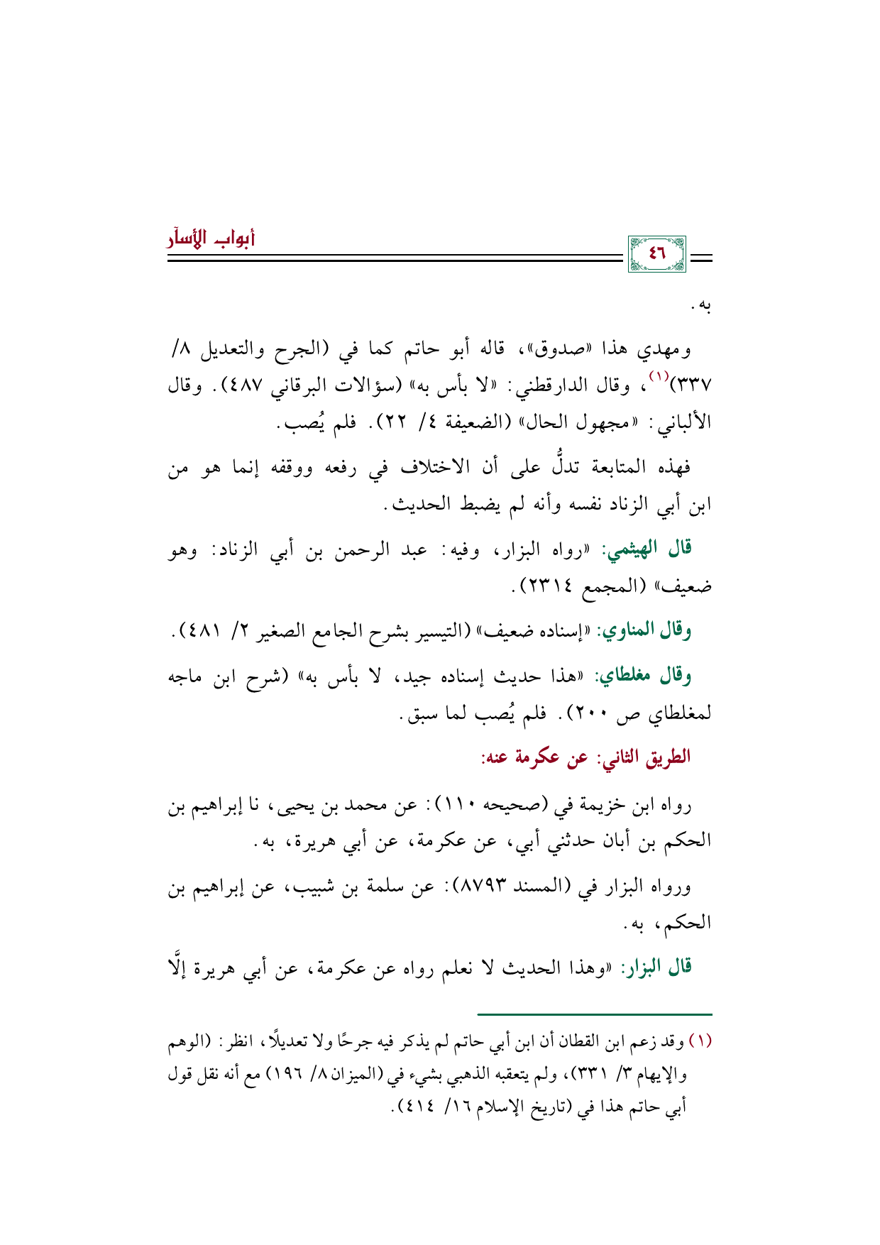 قال البزار: ((وهذا الحديث لا نعلم رواه عن عكرمة، عن أبي هريرة إلَّا