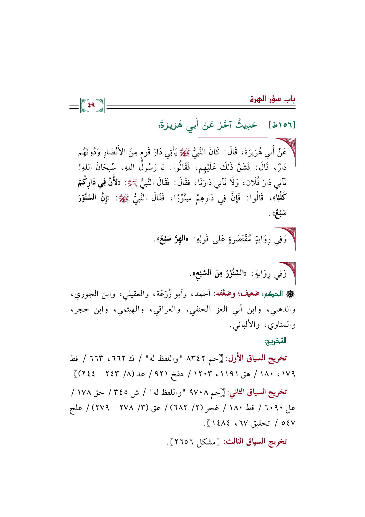 ◼ عَنْ أَبي هُرَيرَةَ، قَالَ: كَانَ النَّبيُّ صلى الله عليه وسلم يَأْتِي دَارَ قَومٍ مِنَ الأَنْصَارِ وَدُونَهُم دَارٌ، قَالَ: فَشَقَّ ذَلكَ عَلَيْهِم، فَقَالُوا: يَا رَسُولَ اللهِ، سُبحَانَ اللهِ! تَأتِي دَارَ فُلَان، وَلَا تَأتي دَارَنَا، فقَالَ: فَقَالَ النَّبيُّ صلى الله عليه وسلم: ((لأَنَّ فِي دَارِكُمْ كَلْبًا))، قَالُوا: فَإِنَّ فِي دَارِهِمْ سِنَّوْرًا، فَقَالَ النَّبيُّ صلى الله عليه وسلم: ((إِنَّ السِّنَّوْرَ سَبُعٌ)).