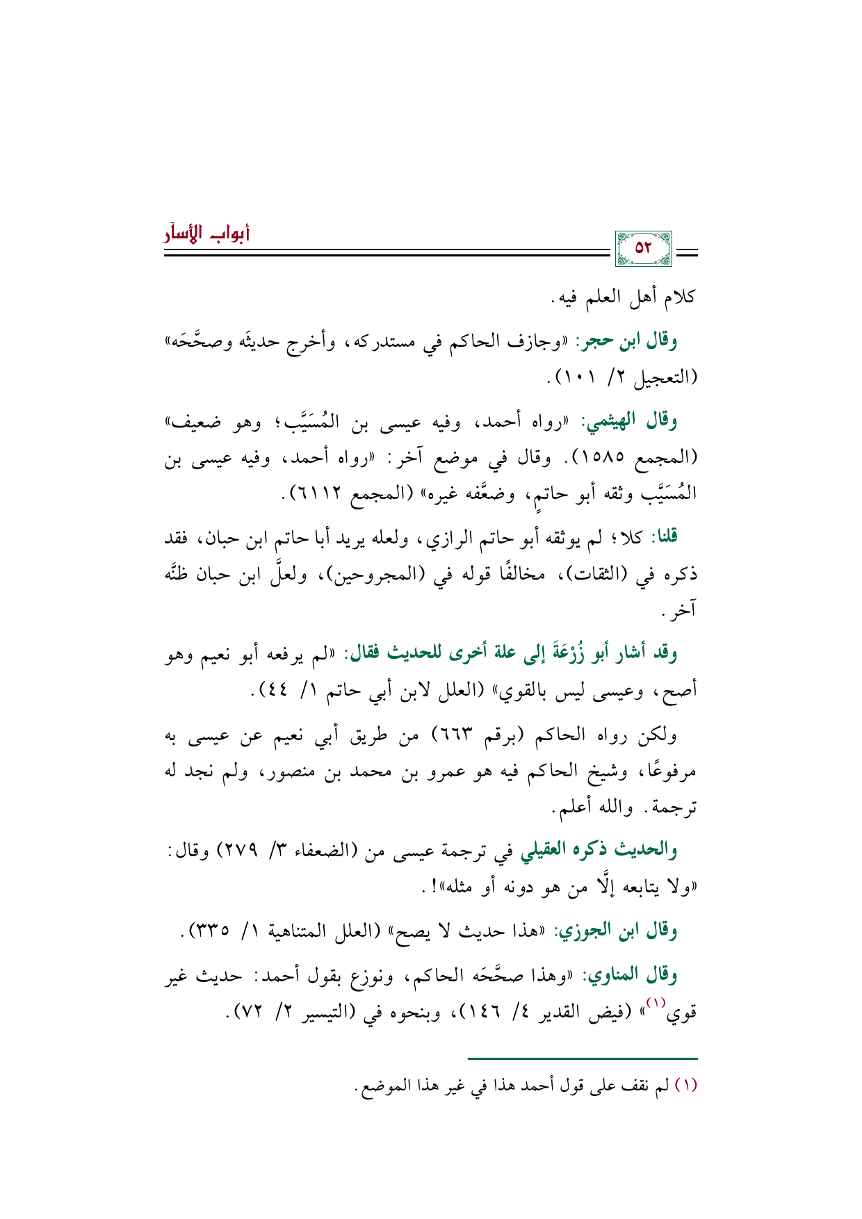 وقال الهيثمي: ((رواه أحمد، وفيه عيسى بن المُسَيَّب؛ وهو ضعيف)) (المجمع ١٥٨٥). وقال في موضع آخر: ((رواه أحمد، وفيه عيسى بن المُسَيَّب وثقه أبو حاتمٍ، وضعَّفه غيره)) (المجمع ٦١١٢).