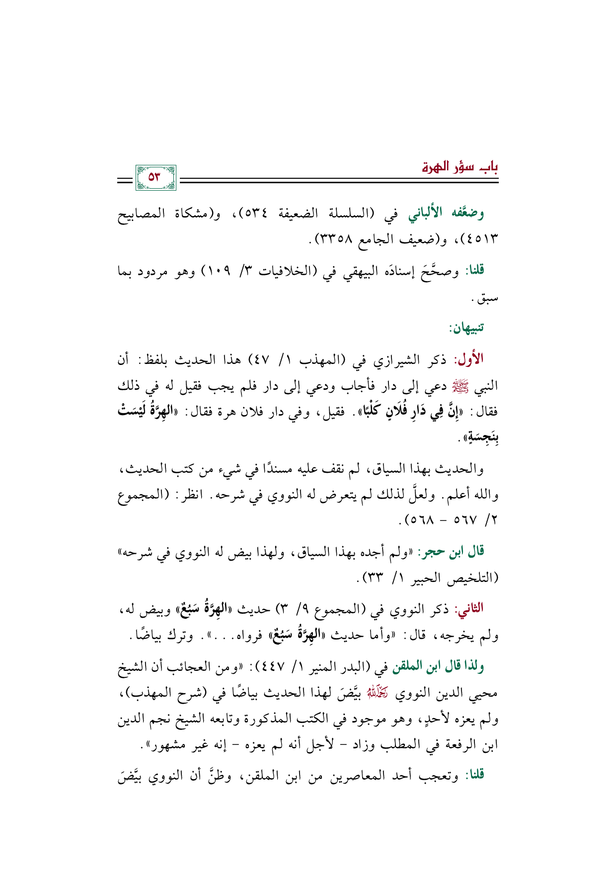 الأول: ذكر الشيرازي في (المهذب ١/ ٤٧) هذا الحديث بلفظ: أن النبي صلى الله عليه وسلم دعي إلى دار فأجاب ودعي إلى دار فلم يجب فقيل له في ذلك فقال: ((إِنَّ فِي دَارِ فُلَانٍ كَلْبًا)). فقيل، وفي دار فلان هرة فقال: ((الهِرَّةُ لَيْسَتْ بِنَجِسَةٍ)).