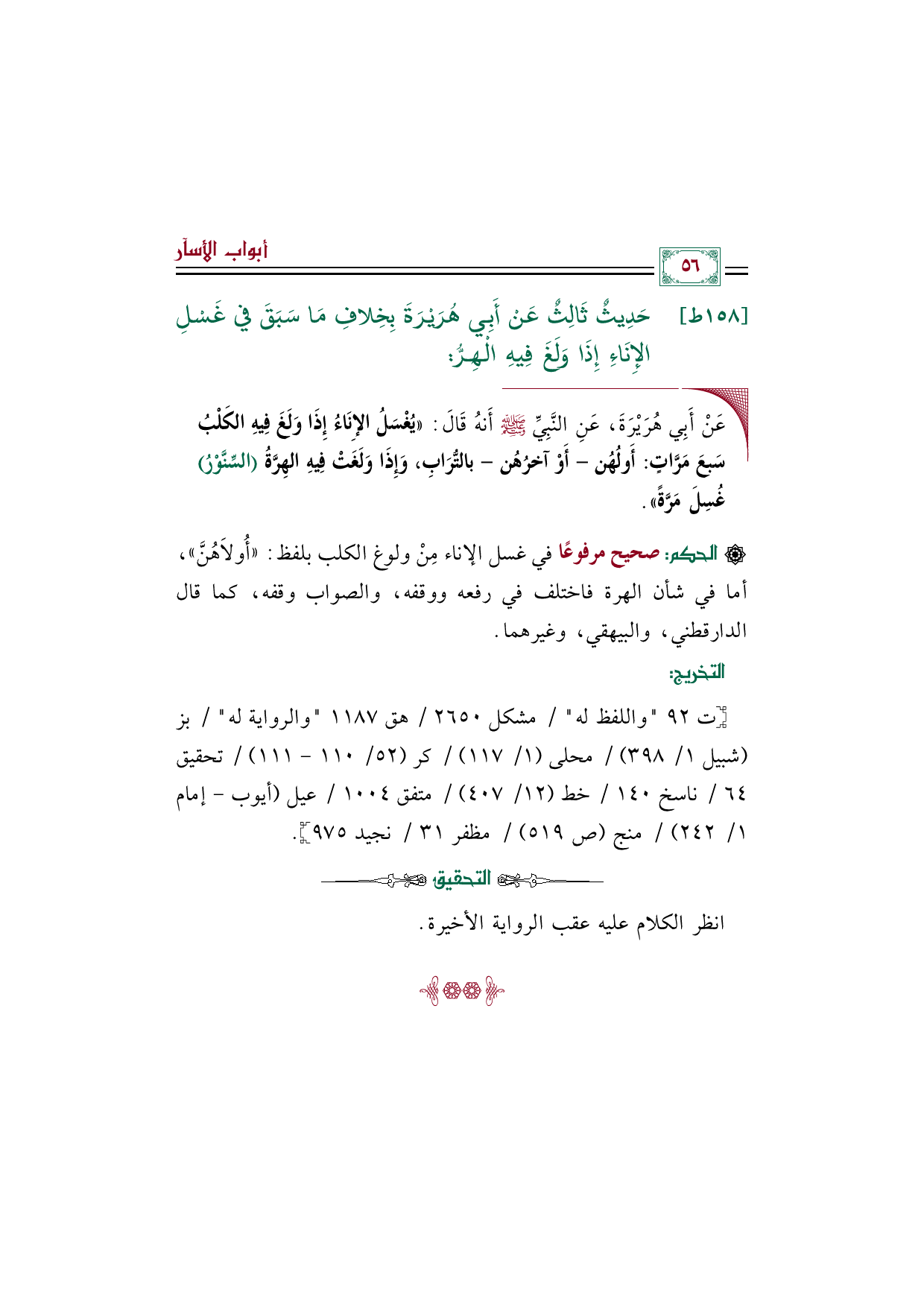 ١٥٨ - حَدِيثٌ ثَالِثٌ عَنْ أَبِي هُرَيْرَةَ بِخِلافِ مَا سَبَقَ ((في غَسْلِ الإِنَاءِ إِذَا وَلَغَ فِيهِ الْهِرُّ)).