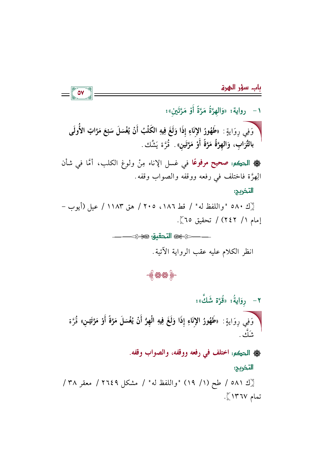 • وَفِي رِوَايةٍ: ((طَهُورُ الإِنَاءِ إِذَا وَلَغَ فِيهِ الْهِرُّ أَنْ يُغْسَلَ مَرَّةً أَوْ مَرَّتَيْنِ)) قُرَّة شَكَّ.