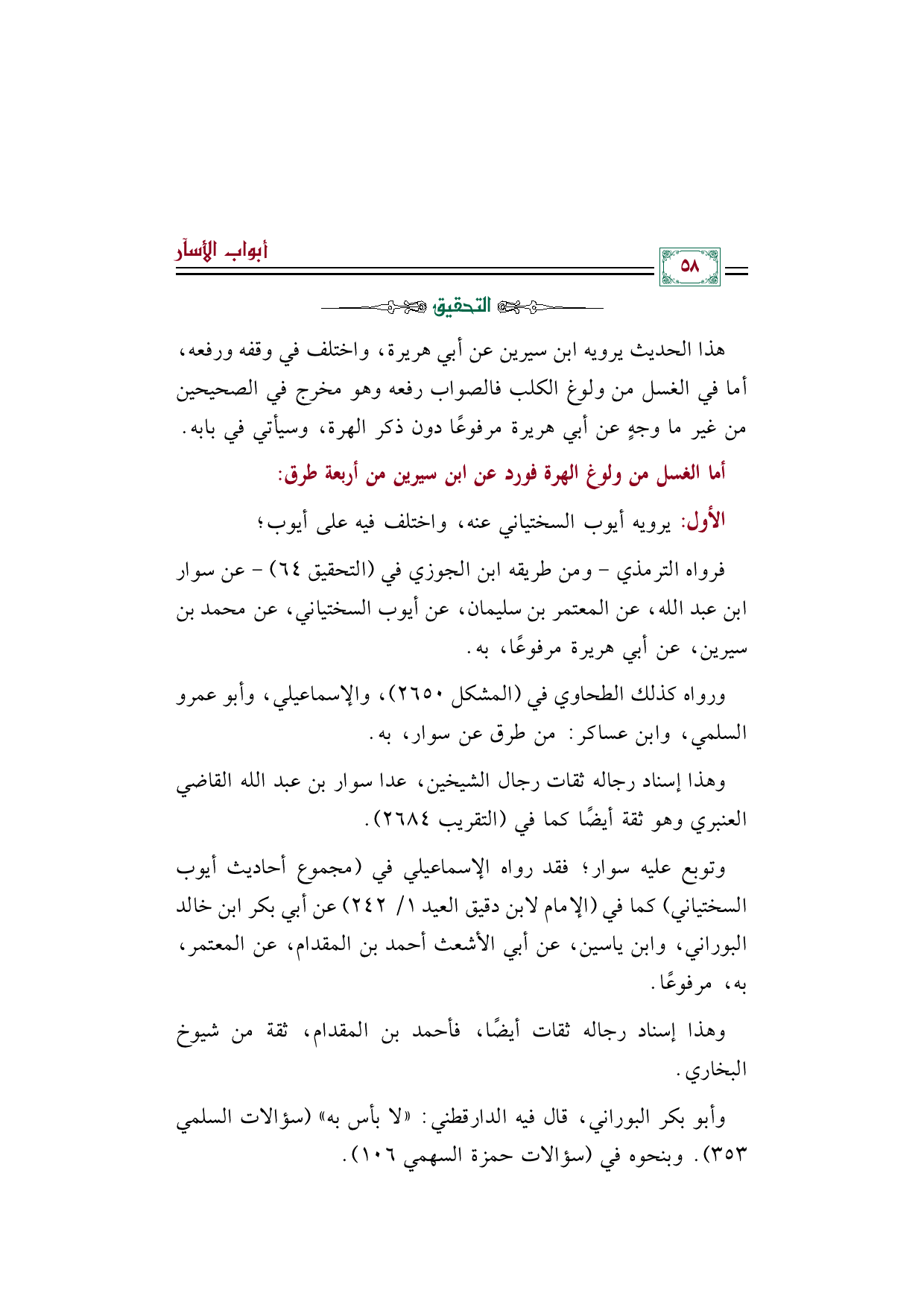 فرواه (الترمذي) - ومن طريقه ابن الجوزي في (التحقيق ٦٤) - عن سوار بن عبد الله، عن المعتمر بن سليمان، عن أيوب السختياني، عن محمد بن سيرين، عن أبي هريرة مرفوعًا، به.