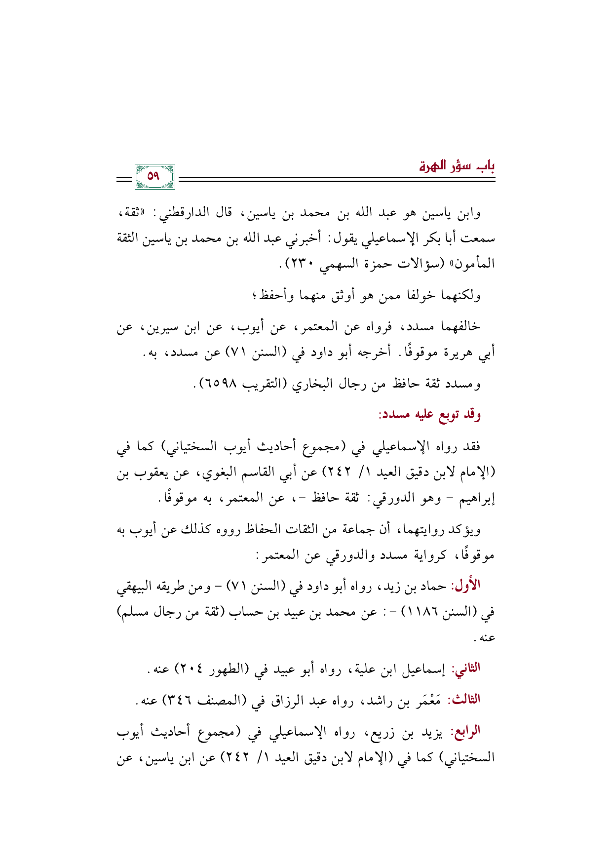 الرابع: يزيد بن زريع، رواه الإسماعيلي في (مجموع أحاديث أيوب السختياني) كما في (الإمام لابن دقيق العيد ١/ ٢٤٢) عن ابن ياسين، عن