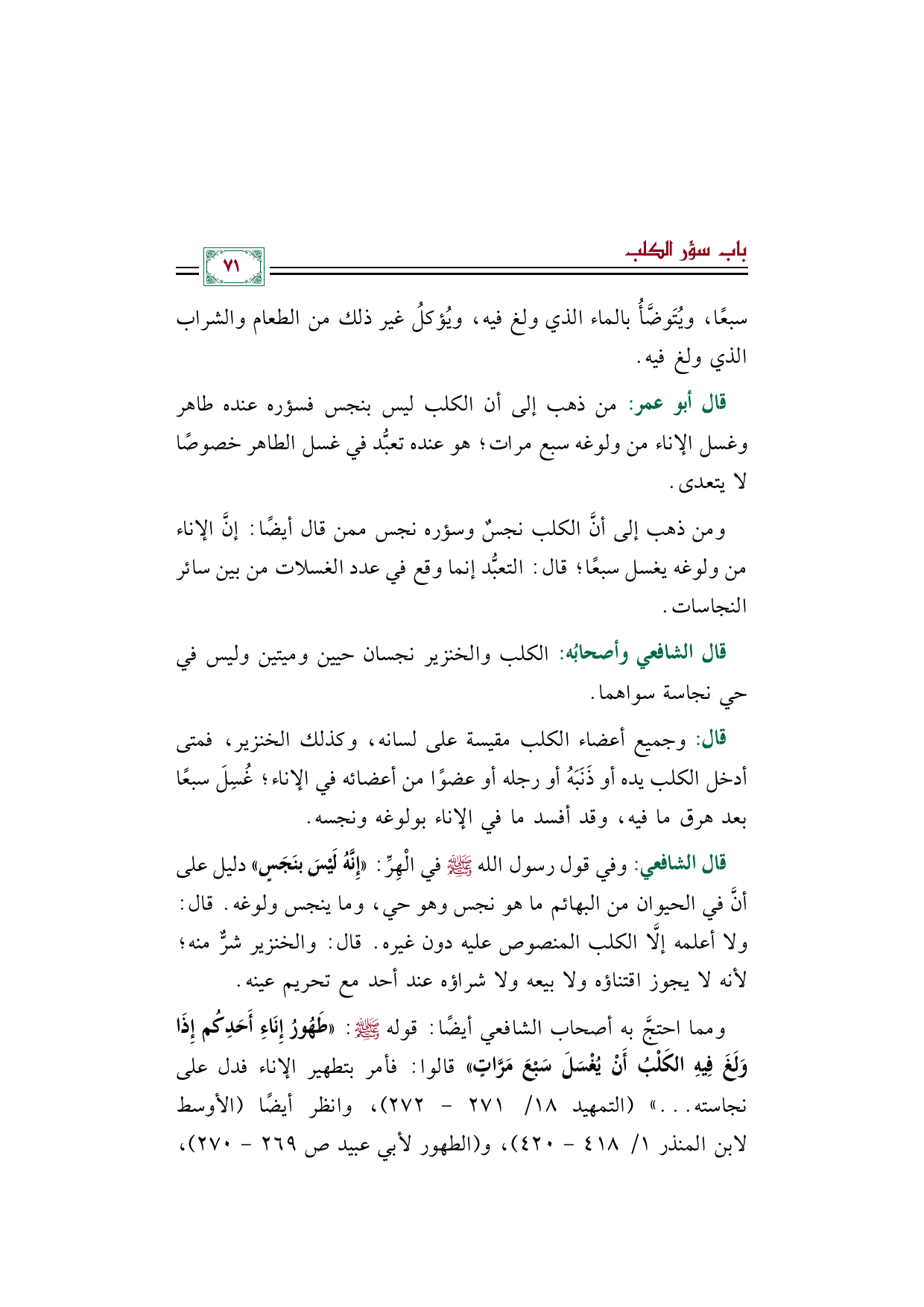 ومما احتجَّ به أصحاب الشافعي أيضًا: قوله صلى الله عليه وسلم: ((طَهُورُ إِنَاءِ أَحَدِكُم إِذَا وَلَغَ فِيهِ الكَلْبُ أَنْ يُغْسَلَ سَبْعَ مَرَّاتٍ)) قالوا: فأمر بتطهير الإناء فدل على نجاسته ... )) (التمهيد ١٨/ ٢٧١ - ٢٧٢)، وانظر أيضًا (الأوسط لابن المنذر ١/ ٤١٨ - ٤٢٠)، و (الطهور لأبي عبيد صـ ٢٦٩ - ٢٧٠)،