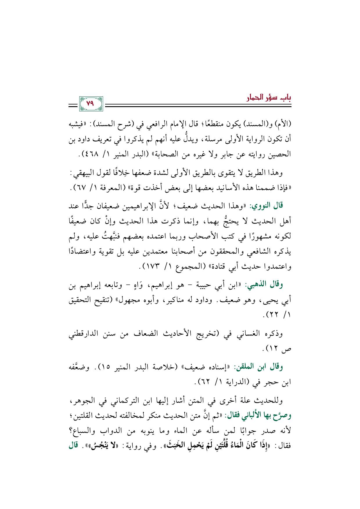 قال النووي: ((وهذا الحديث ضعيف؛ لأنَّ الإبراهيمين ضعيفان جدًّا عند أهل الحديث لا يحتجُّ بهما، وإنما ذكرت هذا الحديث وإنْ كان ضعيفًا لكونه مشهورًا في كتب الأصحاب وربما اعتمده بعضهم فنبَّهتُ عليه، ولم يذكره الشافعي والمحققون من أصحابنا معتمدين عليه بل تقوية واعتضادًا واعتمدوا حديث أبي قتادة)) (المجموع ١/ ١٧٣).