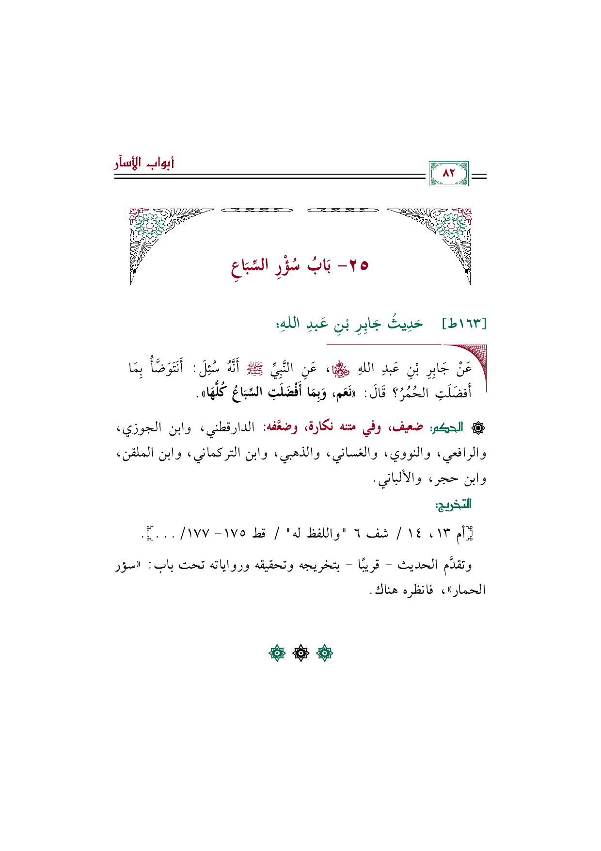 ◼ عَنْ جَابِرِ بْنِ عَبدِ اللهِ رضي الله عنهما، عَنِ النَّبِيِّ صلى الله عليه وسلم أَنَّهُ سُئِلَ: أَنَتَوَضَّأُ بِمَا أَفضَلَتِ الحُمُرُ؟ قَالَ: ((نَعَم، وَبِمَا أَفْضَلَتِ السِّبَاعُ كُلُّهَا)).