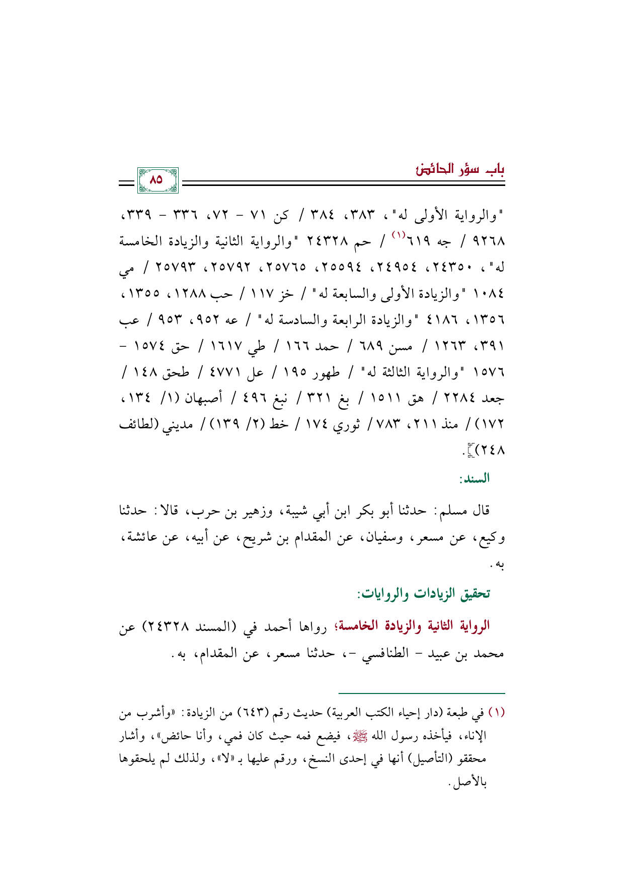 (¬١) في طبعة (دار إحياء الكتب العربية) حديث رقم (٦٤٣) من الزيادة: ((وأشرب من الإناء، فيأخذه رسول الله صلى الله عليه وسلم، فيضع فمه حيث كان فمي، وأنا حائض))، وأشار محققو (التأصيل) أنها في إحدى النسخ، ورقم عليها بـ ((لا))، ولذلك لم يلحقوها بالأصل.