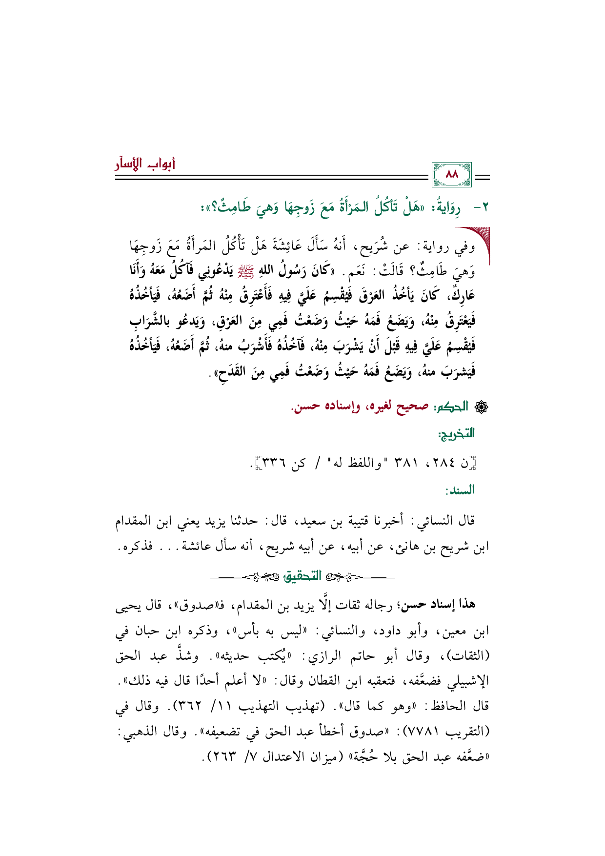 قال النسائي: أخبرنا قتيبة بن سعيد، قال: حدثنا يزيد يعني ابن المقدام بن شريح بن هانئ، عن أبيه، عن أبيه شريح، أنه سأل عائشة ... فذكره.