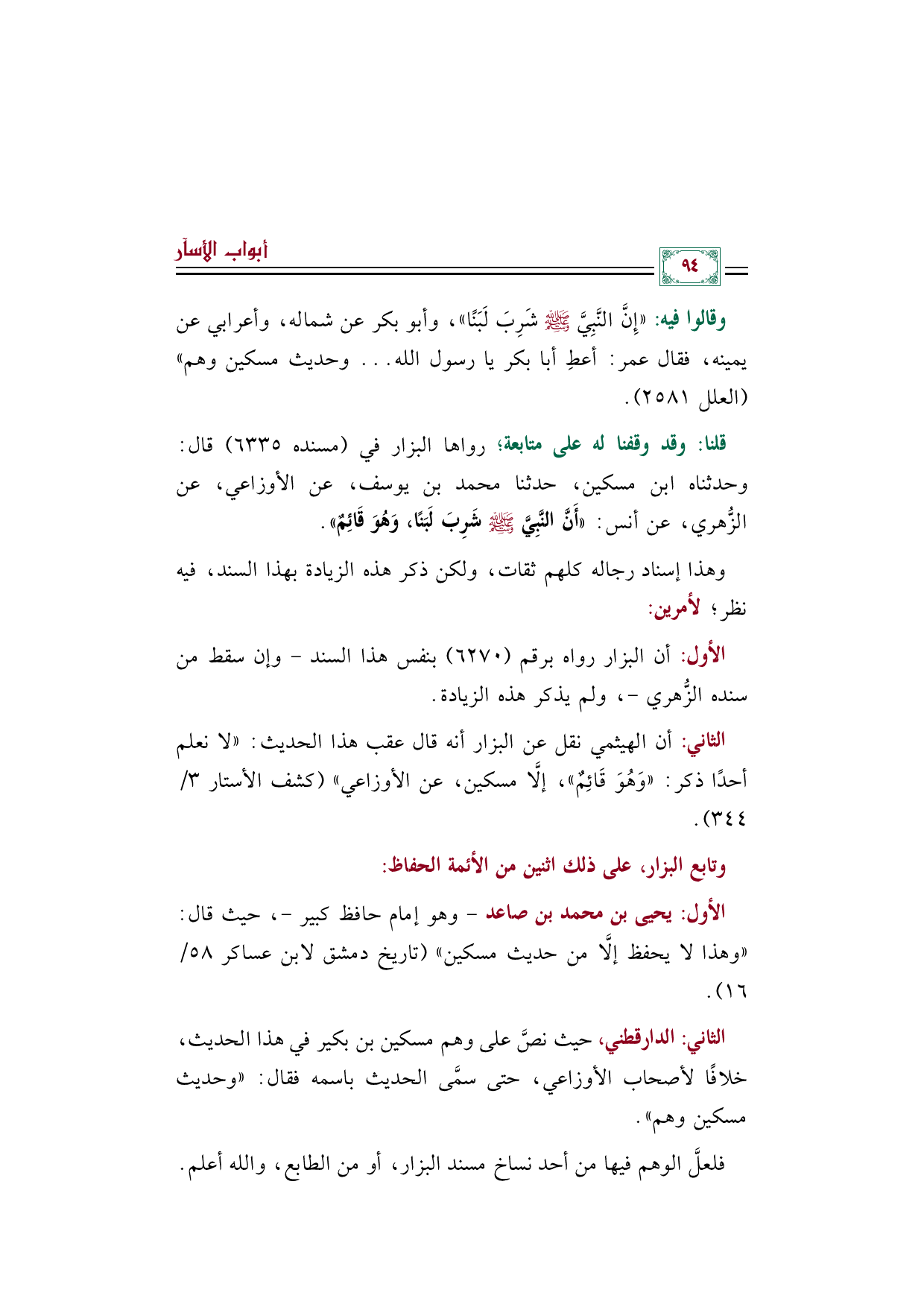 وقالوا فيه: ((إِنَّ النَّبِيَّ صلى الله عليه وسلم شَرِبَ لَبَنًا))، وأبو بكر عن شماله، وأعرابي عن يمينه، فقال عمر: أعطِ أبا بكر يا رسول الله ..... وحديث مسكين وهم)) (العلل ٢٥٨١).