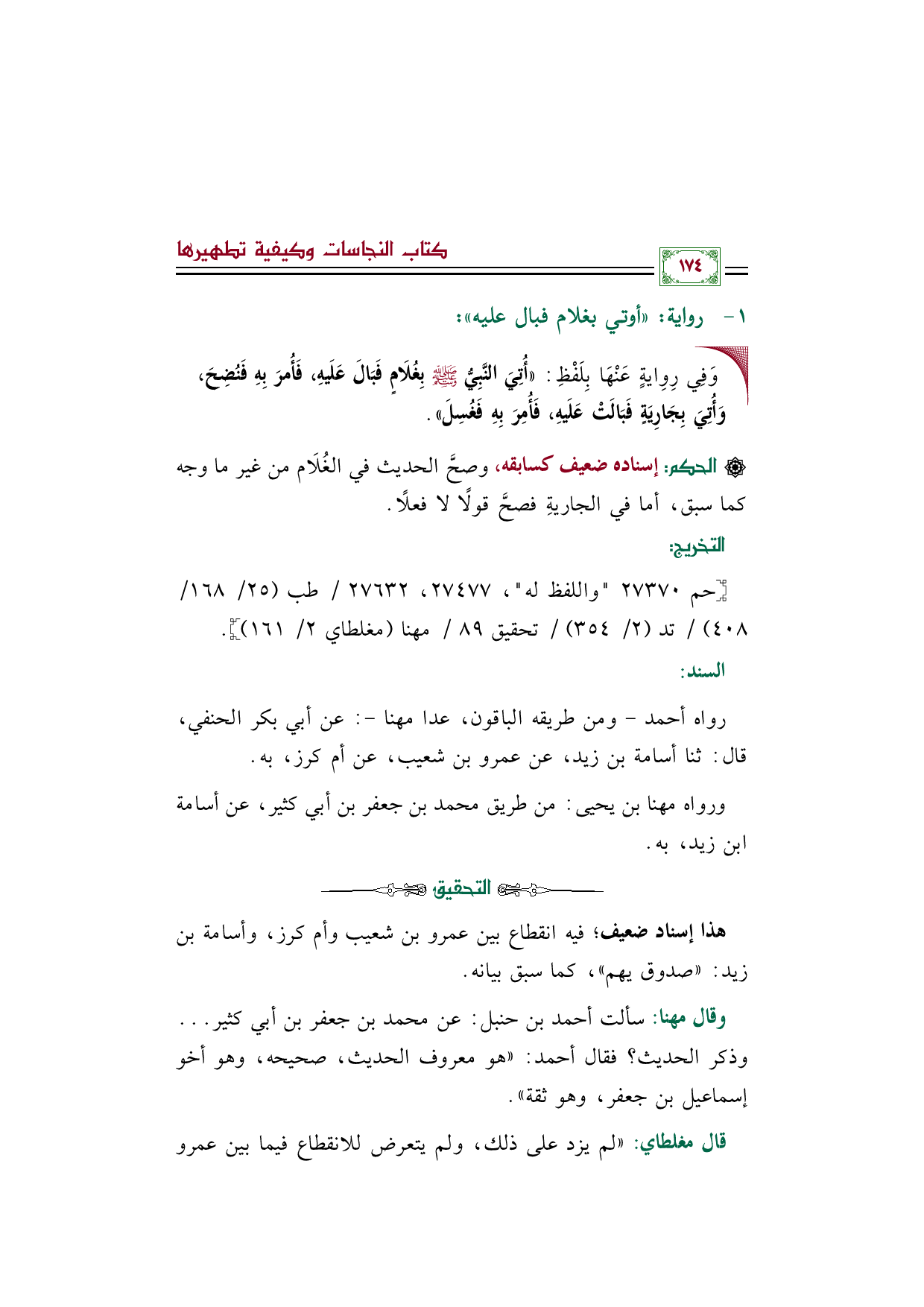 رواه أحمد - ومن طريقه الباقون، عدا مهنا -: عن أبي بكر الحنفي، قال: ثنا أسامة بن زيد، عن عمرو بن شعيب، عن أم كرز، به.