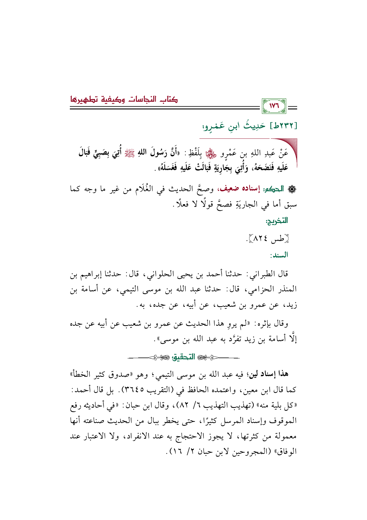 ◼ عَنْ عَبدِ اللهِ بن عَمْرٍو رضي الله عنهما بِلَفْظِ: ((أَنَّ رَسُولَ اللهِ صلى الله عليه وسلم أُتِيَ بِصَبِيٍّ فَبَالَ عَلَيهِ فَنَضَحَهُ، وَأُتِيَ بِجَارِيَةٍ فَبَالَتْ عَلَيهِ فَغَسَلَهُ)).