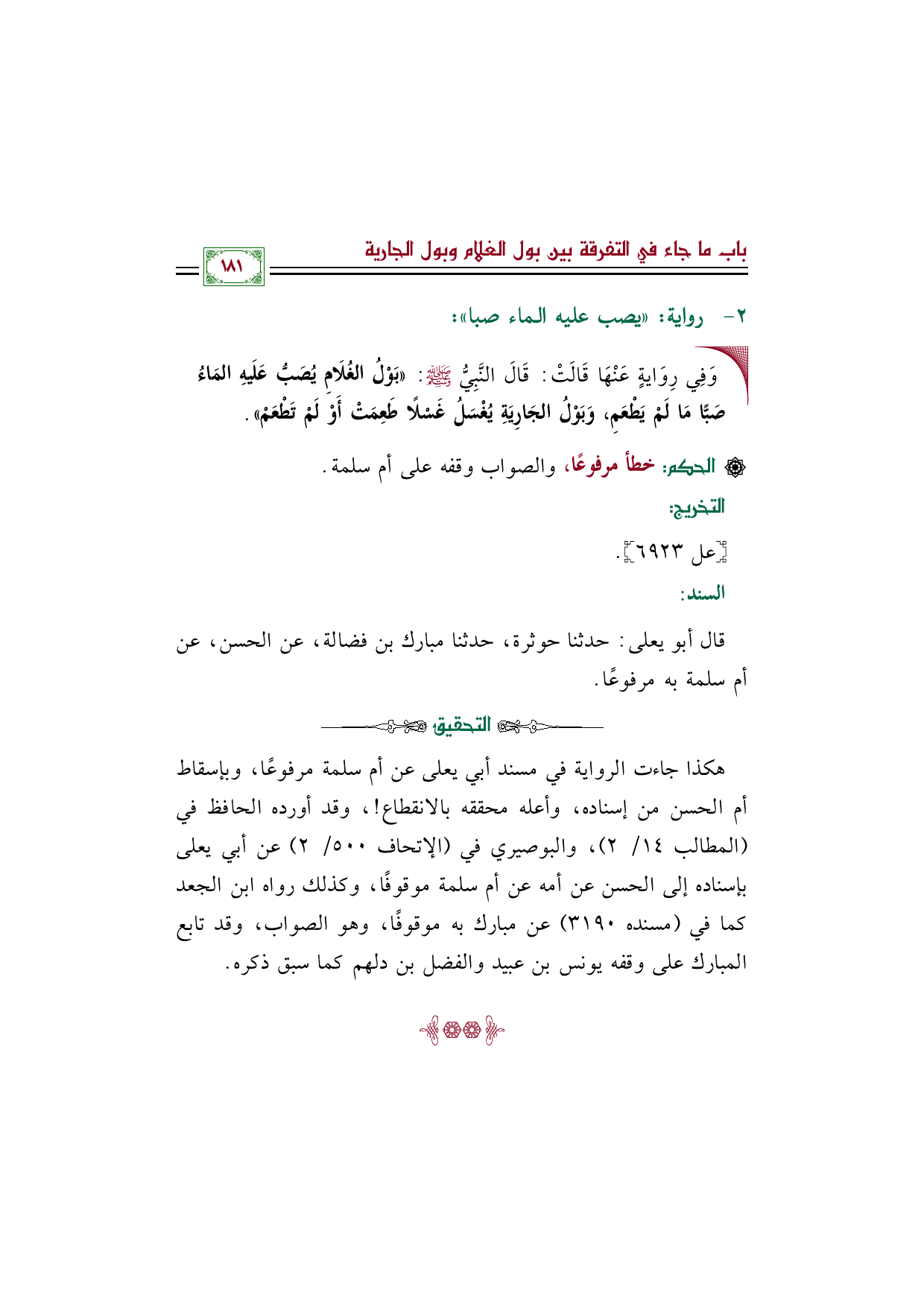 هكذا جاءت الرواية في مسند أبي يعلى عن أم سلمة مرفوعًا، وبإسقاط أم الحسن من إسناده، وأعله محققه بالانقطاع!، وقد أورده الحافظ في (المطالب ١٤/ ٢)، والبوصيري في (الإتحاف ٥٠٠/ ٢) عن أبي يعلى بإسناده إلى الحسن عن أمه عن أم سلمة موقوفًا، وكذلك رواه ابن الجعد كما في (مسنده ٣١٩٠) عن مبارك به موقوفًا، وهو الصواب، وقد تابع المبارك على وقفه يونس بن عبيد والفضل بن دلهم كما سبق ذكره.