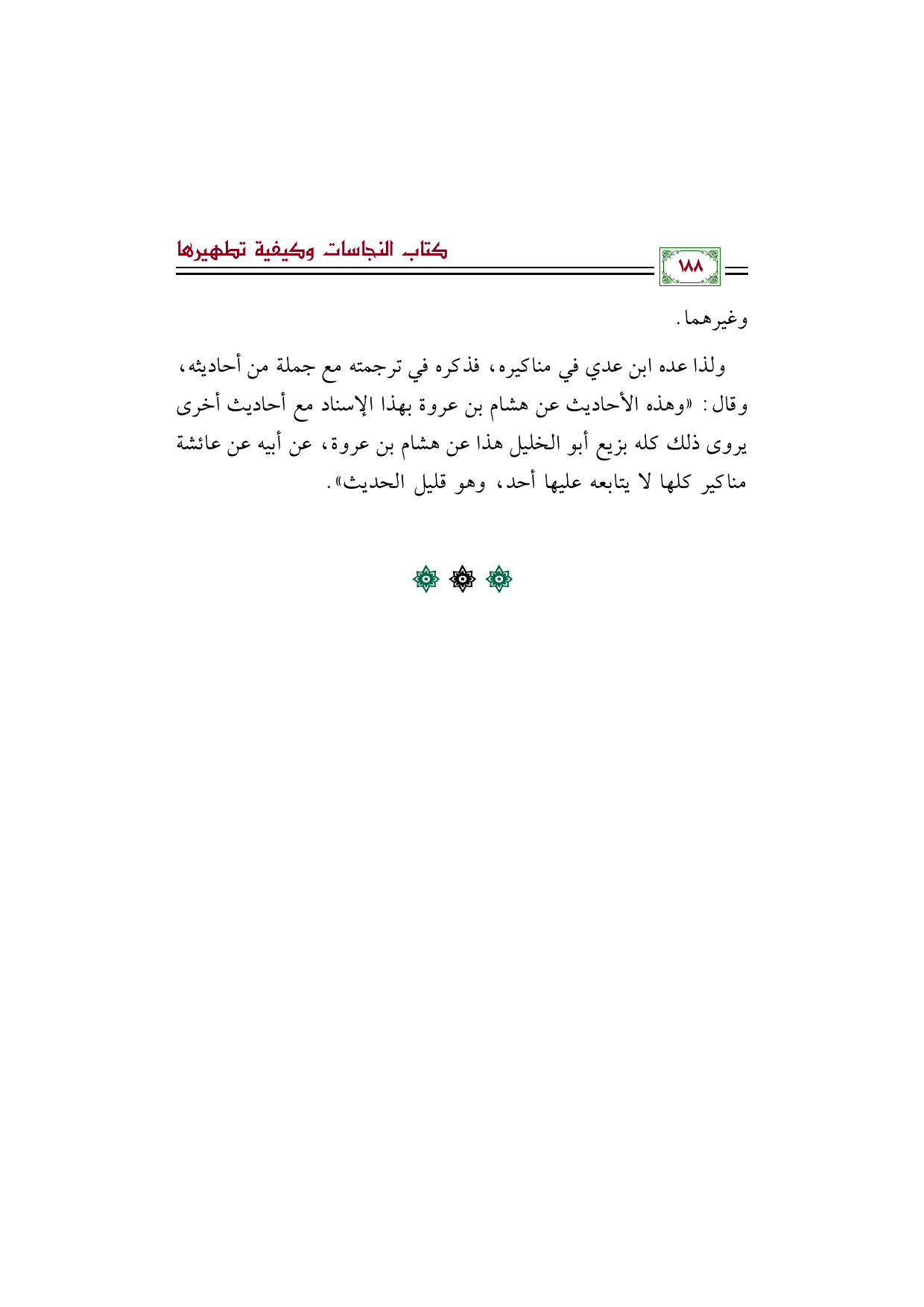ولذا عده ابن عدي في مناكيره، فذكره في ترجمته مع جملة من أحاديثه، وقال: ((وهذه الأحاديث عن هشام بن عروة بهذا الإسناد مع أحاديث أخرى يروى ذلك كله بزيع أبو الخليل هذا عن هشام بن عروة، عن أبيه عن عائشة مناكير كلها لا يتابعه عليها أحد، وهو قليل الحديث)).