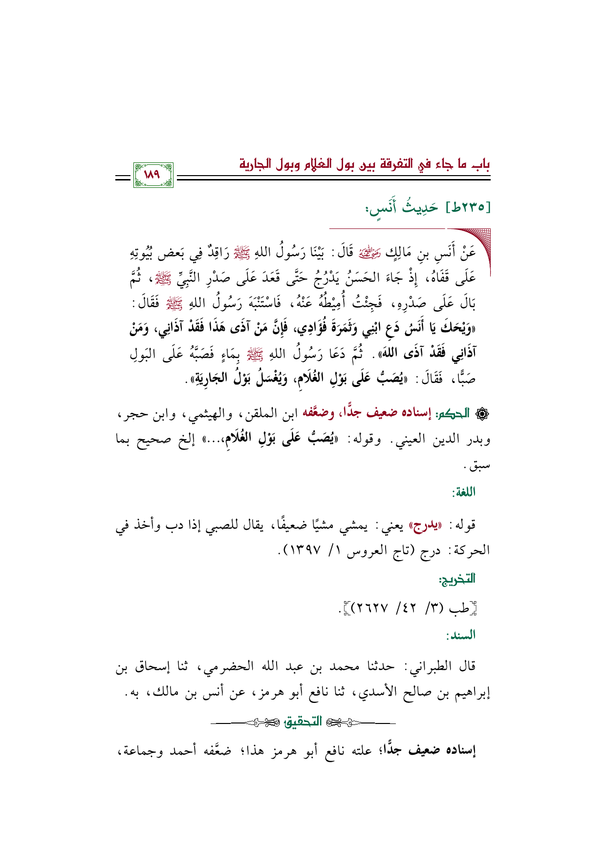 ◼ عَنْ أَنَسِ بنِ مَالِكٍ رضي الله عنه قَالَ: بَيْنَا رَسُولُ اللهِ صلى الله عليه وسلم رَاقِدٌ فِي بَعض بُيُوتِهِ عَلَى قَفَاهُ، إِذْ جَاءَ الحَسَنُ يَدْرُجُ حَتَّى قَعَدَ عَلَى صَدْرِ النَّبِيِّ صلى الله عليه وسلم، ثُمَّ بَالَ عَلَى صَدْرِهِ، فَجِئْتُ أُمِيْطُهُ عَنْهُ، فَاسْتَنْبَهَ رَسُولُ اللهِ صلى الله عليه وسلم فَقَالَ: ((وَيْحَكَ يَا أَنَسُ دَعِ ابْنِي وَثَمَرَةَ فُؤَادِي، فَإِنَّ مَنْ آذَى هَذَا فَقَدْ آذَانِي، وَمَنْ آذَانِي فَقَدْ آذَى اللهَ)). ثُمَّ دَعَا رَسُولُ اللهِ صلى الله عليه وسلم بِمَاءٍ فَصَبَّهُ عَلَى البَولِ صَبًّا، فَقَالَ: ((يُصَبُّ عَلَى بَوْلِ الغُلَامِ، وَيُغْسَلُ بَوْلُ الجَارِيَةِ)).