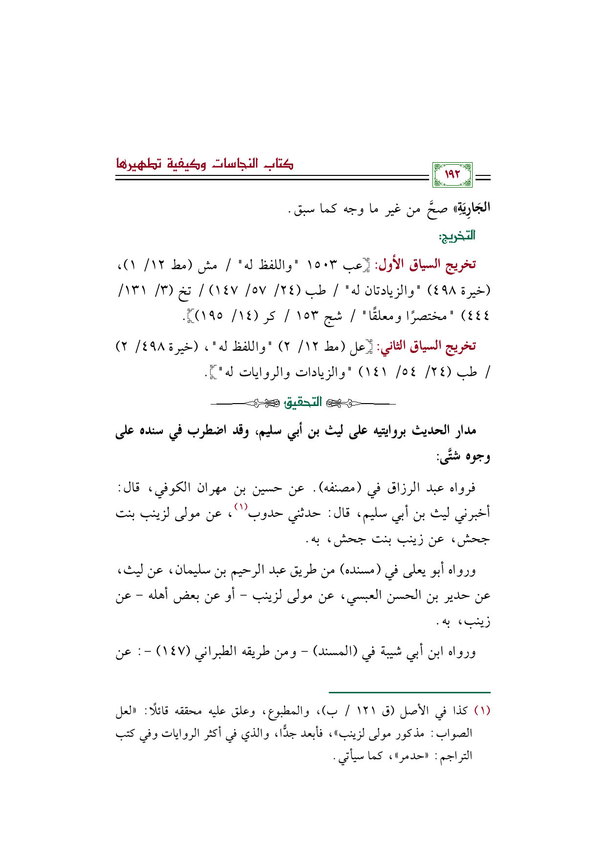 فرواه عبد الرزاق في (مصنفه). عن حسين بن مهران الكوفي، قال: أخبرني ليث بن أبي سليم، قال: حدثني حدوب (¬١)، عن مولى لزينب بنت جحش، عن زينب بنت جحش، به.