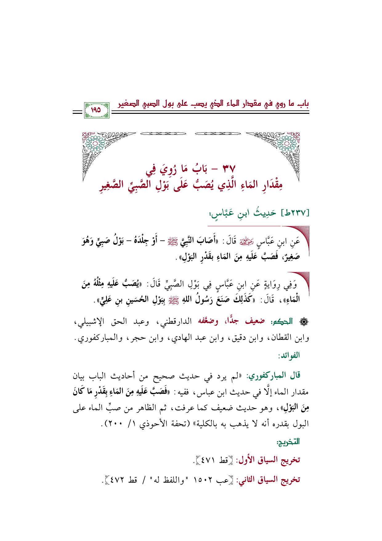 • وَفِي رِوَايةٍ عَنِ ابنِ عَبَّاسٍ فِي بَوْلِ الصَّبِيِّ قَالَ: ((يُصَبُّ عَلَيهِ مِثْلُهُ مِنَ الْمَاءِ))، قَالَ: ((كَذَلِكَ صَنَعَ رَسُولُ اللهِ صلى الله عليه وسلم بِبَوْلِ الحُسَينِ بنِ عَلِيٍّ)).