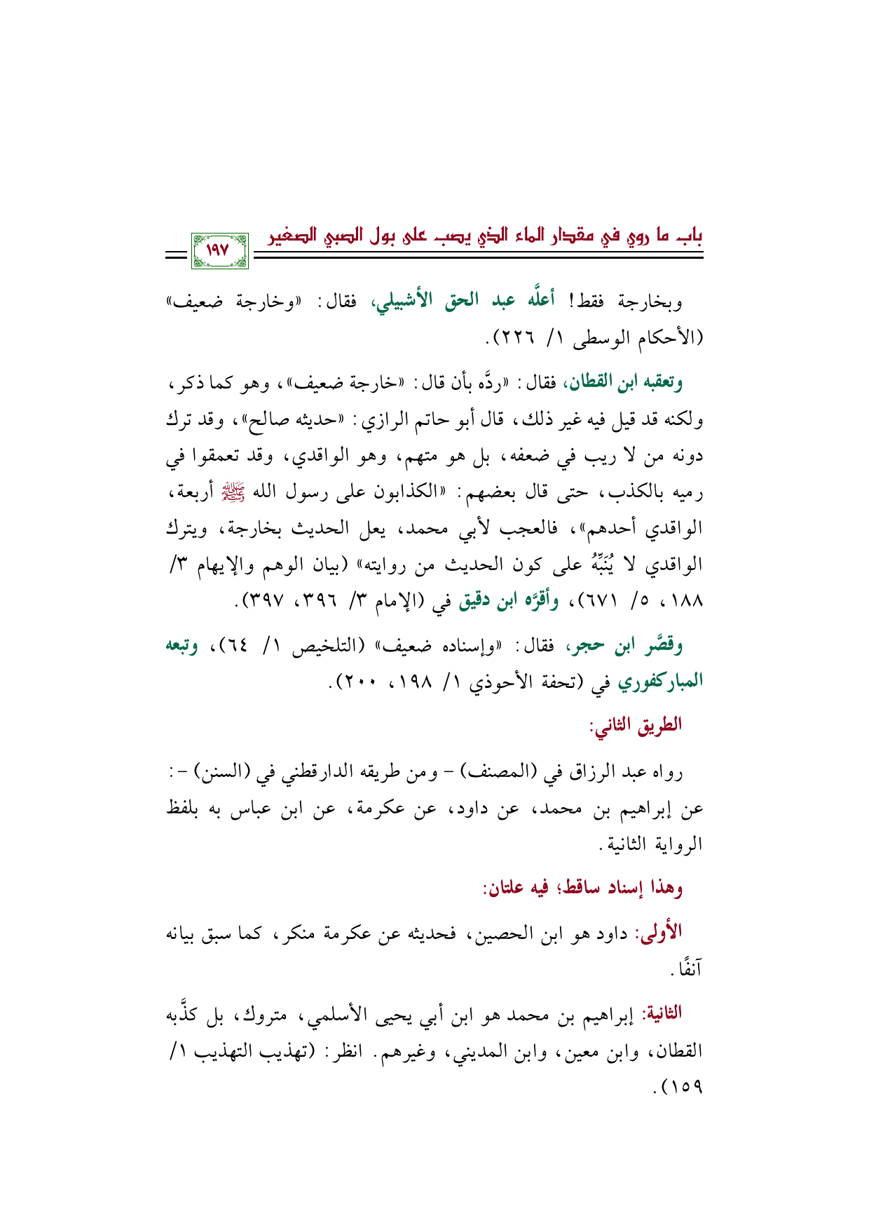 وتعقبه ابن القطان، فقال: ((ردَّه بأن قال: ((خارجة ضعيف))، وهو كما ذكر، ولكنه قد قيل فيه غير ذلك، قال أبو حاتم الرازي: ((حديثه صالح))، وقد ترك دونه من لا ريب في ضعفه، بل هو متهم، وهو الواقدي، وقد تعمقوا في رميه بالكذب، حتى قال بعضهم: ((الكذابون على رسول الله صلى الله عليه وسلم أربعة، الواقدي أحدهم))، فالعجب لأبي محمد، يعل الحديث بخارجة، ويترك الواقدي لا يُنَبِّهُ على كون الحديث من روايته)) (بيان الوهم والإيهام ٣/ ١٨٨، ٥/ ٦٧١)، وأقرَّه ابن دقيق في (الإمام ٣/ ٣٩٦، ٣٩٧).