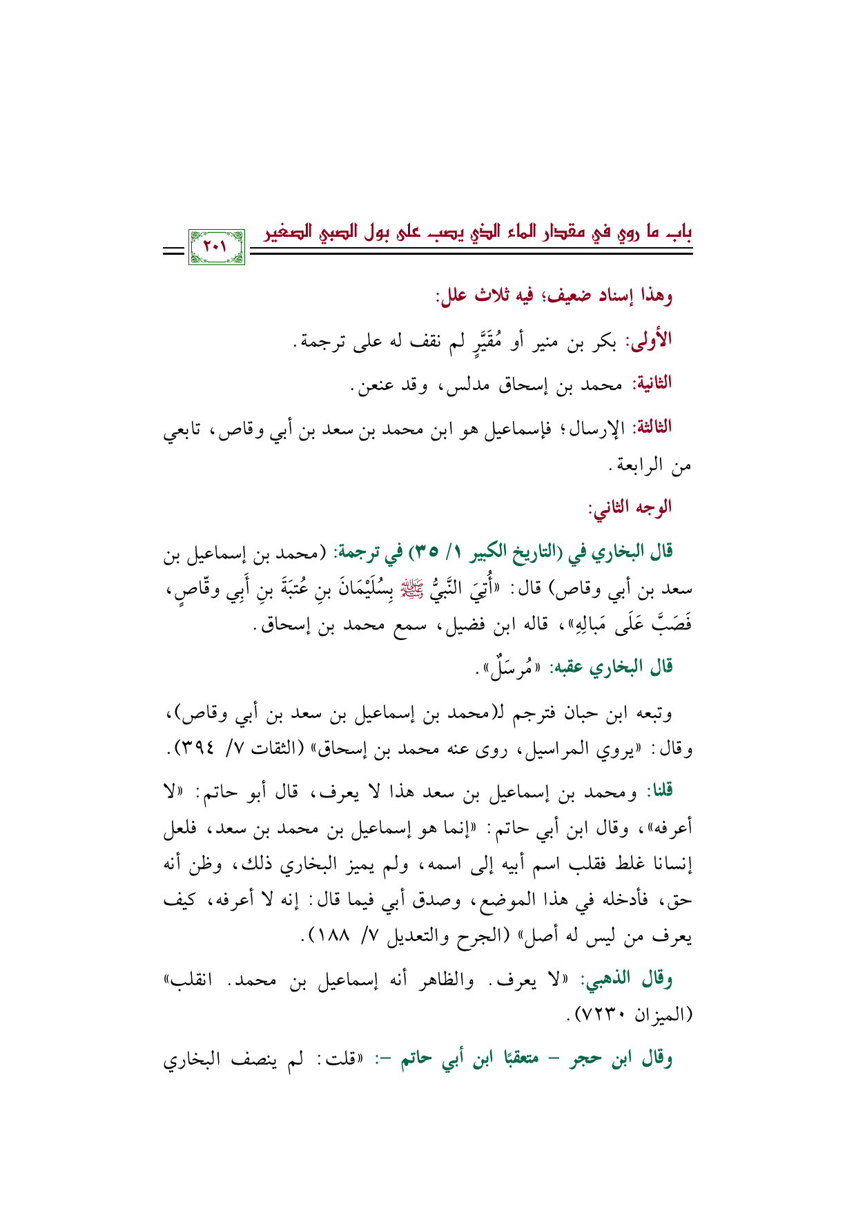 قلنا: ومحمد بن إسماعيل بن سعد هذا لا يعرف، قال أبو حاتم: ((لا أعرفه))، وقال ابن أبي حاتم: ((إنما هو إسماعيل بن محمد بن سعد، فلعل إنسانا غلط فقلب اسم أبيه إلى اسمه، ولم يميز البخاري ذلك، وظن أنه حق، فأدخله في هذا الموضع، وصدق أبي فيما قال: إنه لا أعرفه، كيف يعرف من ليس له أصل)) (الجرح والتعديل ٧/ ١٨٨).
