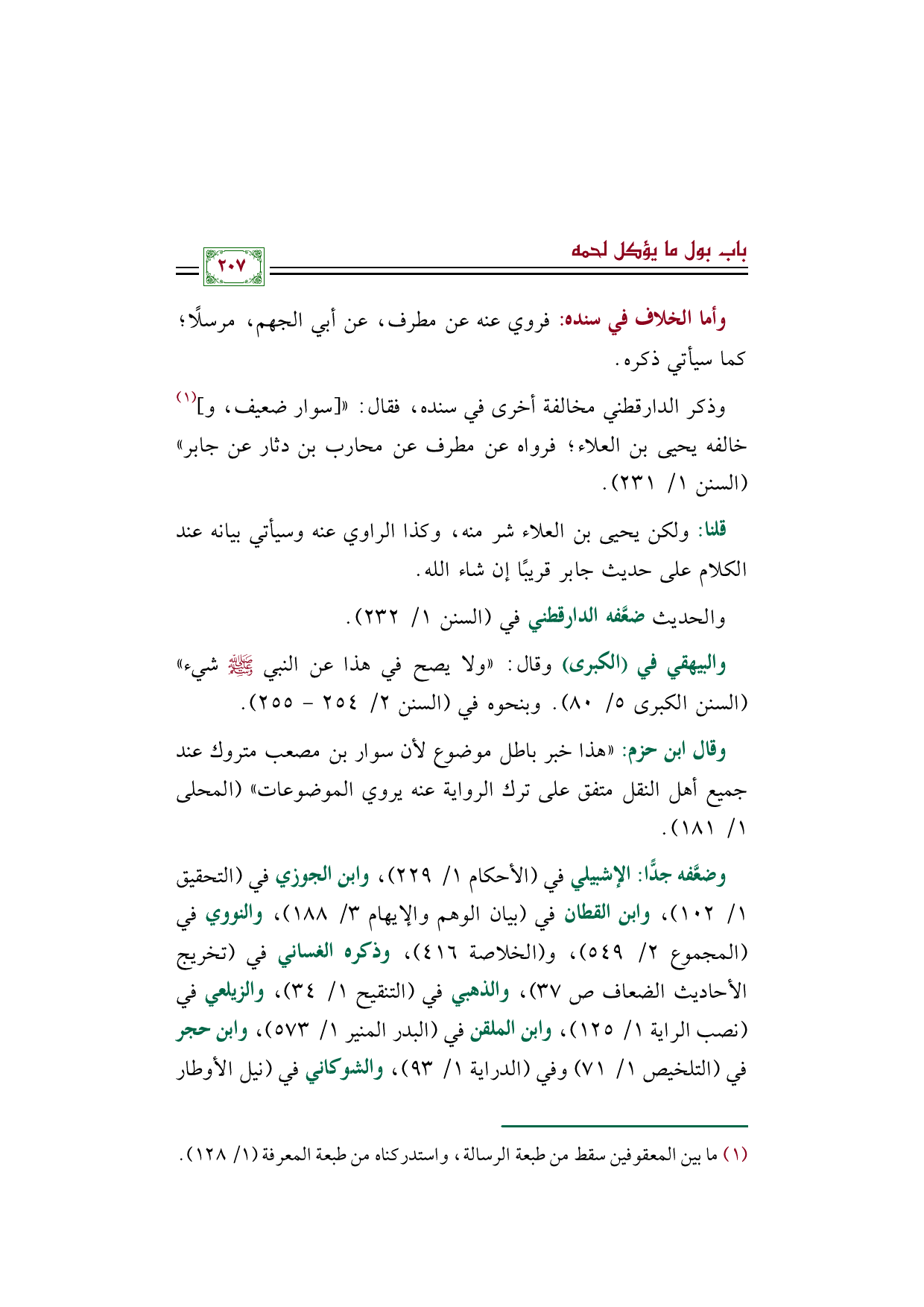 وذكر الدارقطني مخالفة أخرى في سنده، فقال: (([سوار ضعيف، و] (¬١) خالفه يحيى بن العلاء؛ فرواه عن مطرف عن محارب بن دثار عن جابر)) (السنن ١/ ٢٣١).