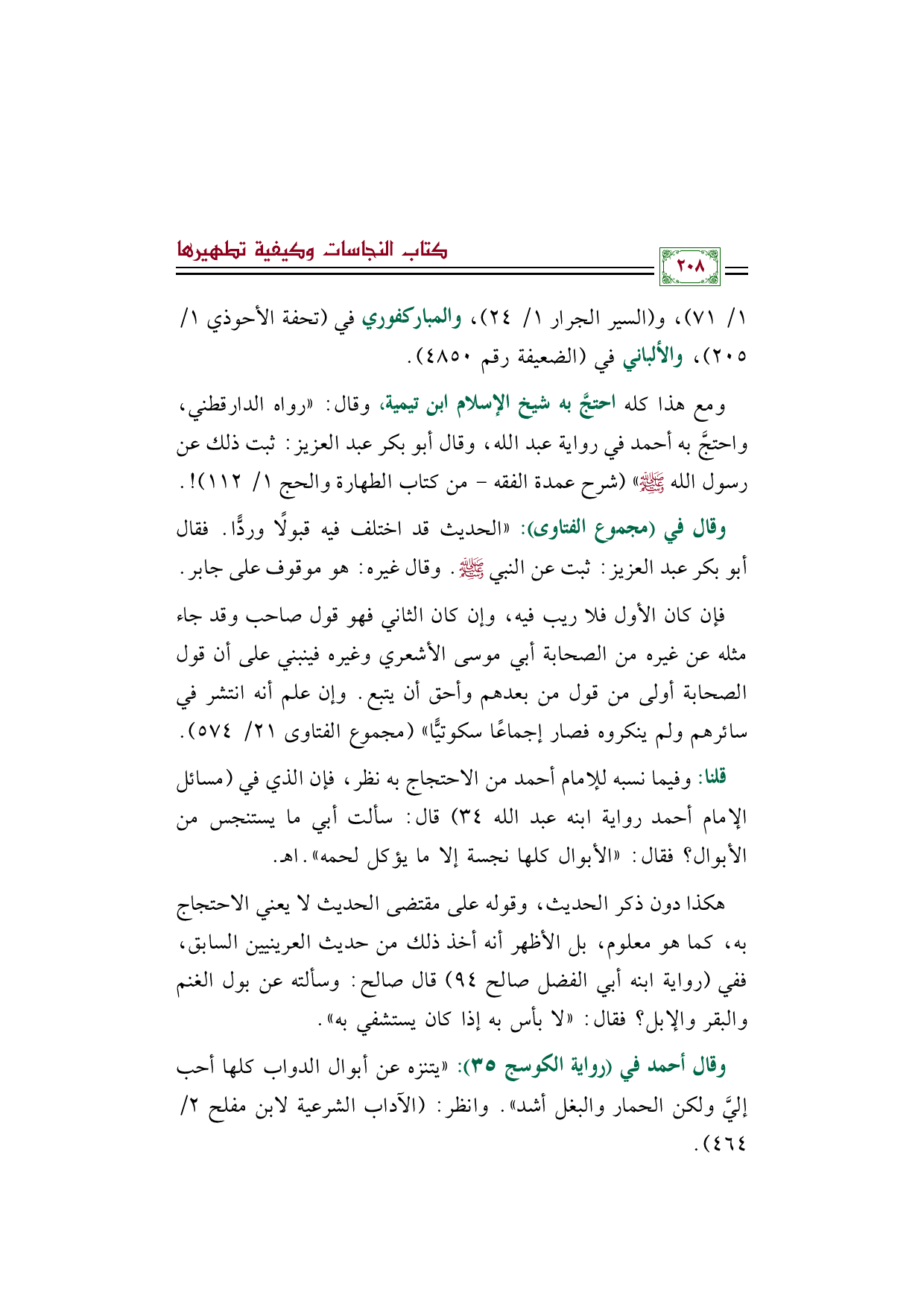 قلنا: وفيما نسبه للإمام أحمد من الاحتجاج به نظر، فإن الذي في (مسائل الإمام أحمد رواية ابنه عبد الله ٣٤) قال: سألت أبي ما يستنجس من الأبوال؟ فقال: ((الأبوال كلها نجسة إلا ما يؤكل لحمه)). اهـ.