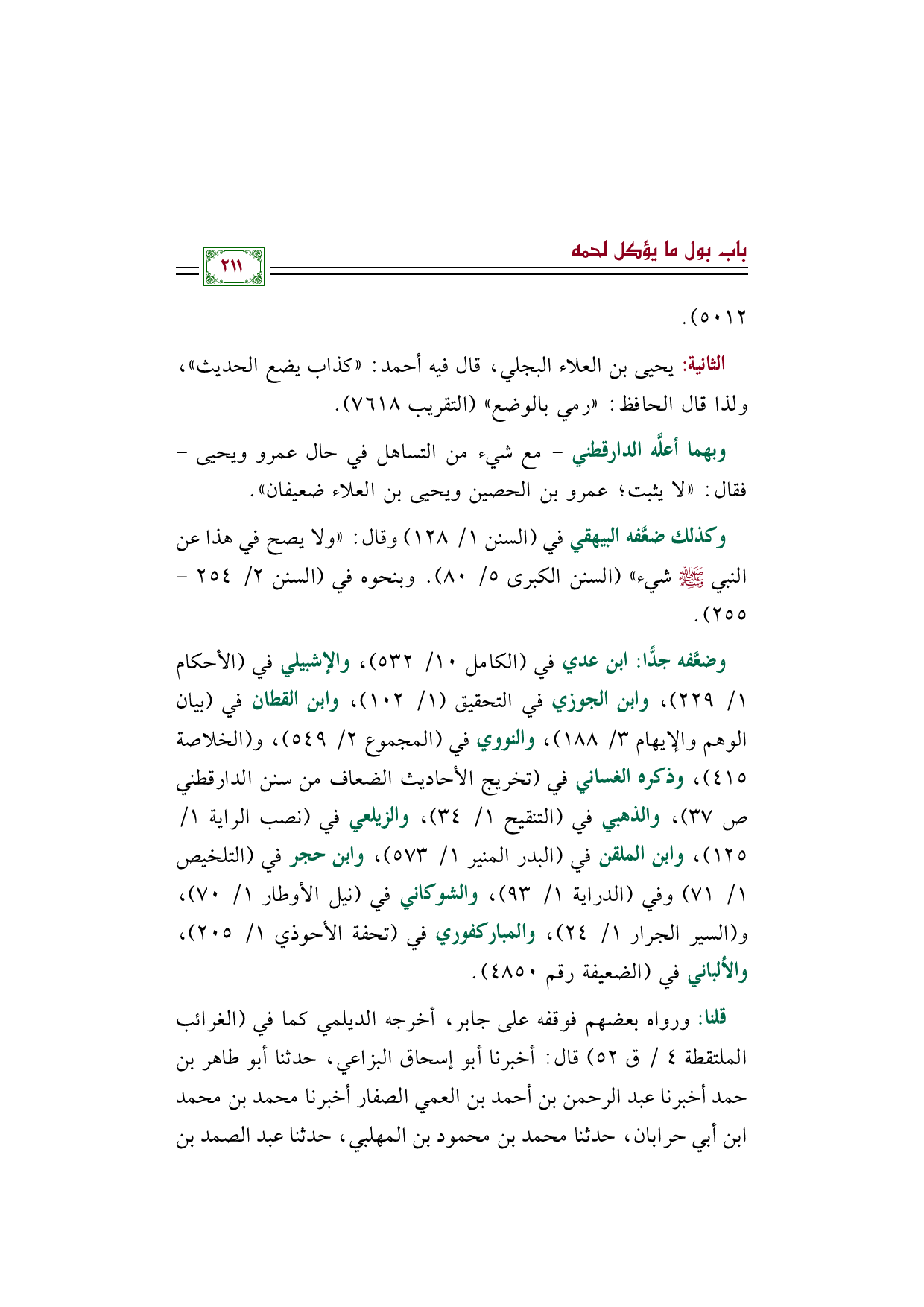 وضعَّفه جدًّا: ابن عدي في (الكامل ١٠/ ٥٣٢)، والإشبيلي في (الأحكام ١/ ٢٢٩)، وابن الجوزي في التحقيق (١/ ١٠٢)، وابن القطان في (بيان الوهم والإيهام ٣/ ١٨٨)، والنووي في (المجموع ٢/ ٥٤٩)، و (الخلاصة ٤١٥)، وذكره الغساني في (تخريج الأحاديث الضعاف من سنن الدارقطني صـ ٣٧)، والذهبي في (التنقيح ١/ ٣٤)، والزيلعي في (نصب الراية ١/ ١٢٥)، وابن الملقن في (البدر المنير ١/ ٥٧٣)، وابن حجر في (التلخيص ١/ ٧١) وفي (الدراية ١/ ٩٣)، والشوكاني في (نيل الأوطار ١/ ٧٠)، و (السير الجرار ١/ ٢٤)، والمباركفوري في (تحفة الأحوذي ١/ ٢٠٥)، والألباني في (الضعيفة رقم ٤٨٥٠).