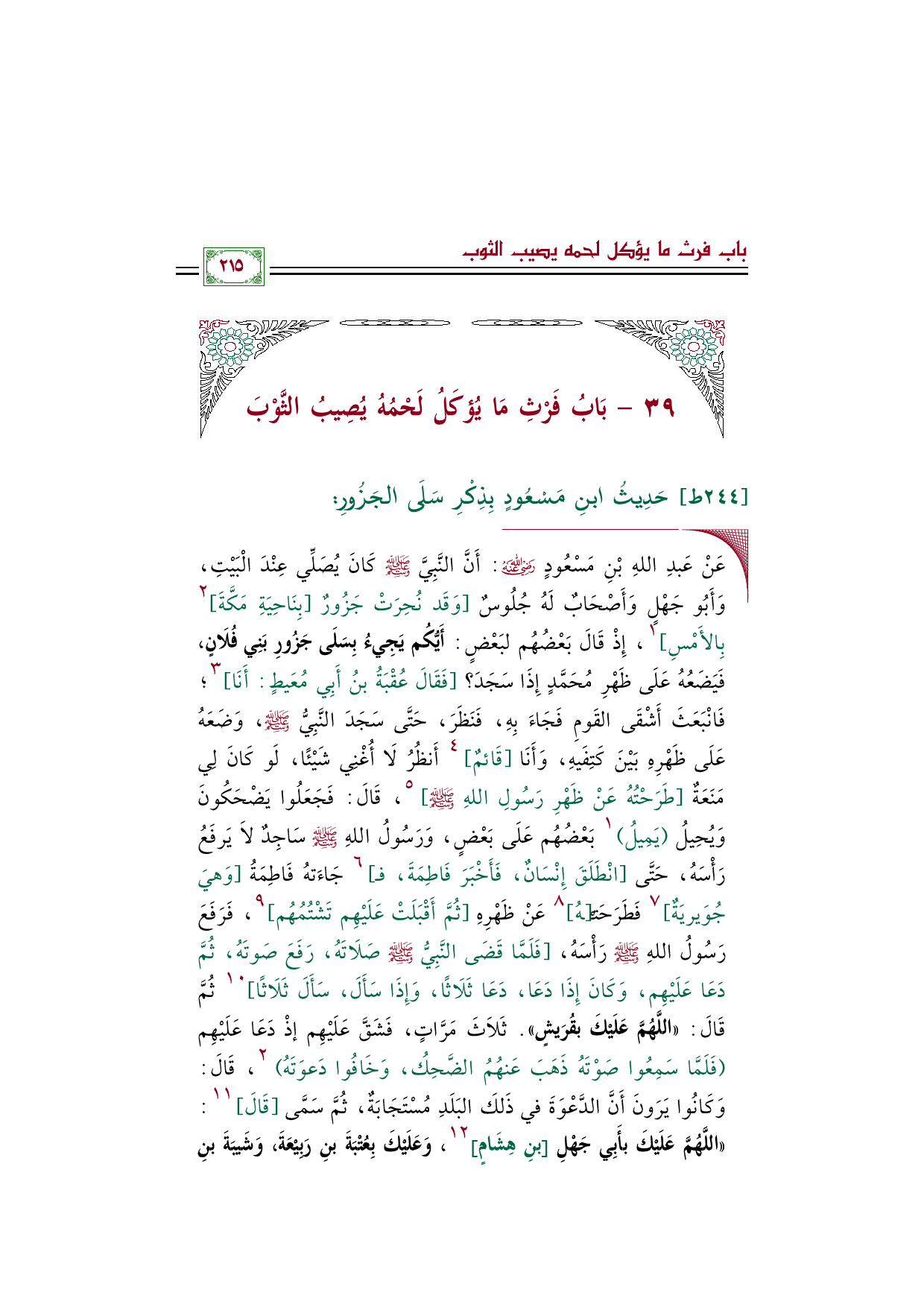 ◼ عَنْ عَبدِ اللهِ بْنِ مَسْعُودٍ رضي الله عنه: أَنَّ النَّبِيَّ صلى الله عليه وسلم كَانَ يُصَلِّي عِنْدَ الْبَيْتِ، وَأَبُو جَهْلٍ وَأَصْحَابٌ لَهُ جُلُوسٌ [وَقَد نُحِرَتْ جَزُورٌ [بِنَاحِيَةِ مَكَّةَ] ٢ بِالأَمْسِ] ١، إِذْ قَالَ بَعْضُهُم لبَعْضٍ: أَيُّكُم يَجِيءُ بِسَلَى جَزُورِ بَنِي فُلَانٍ، فَيَضَعُهُ عَلَى ظَهْرِ مُحَمَّدٍ إِذَا سَجَدَ؟ [فَقَالَ عُقْبَةُ بنُ أَبِي مُعَيطٍ: أَنَا] ٣؛ فَانْبَعَثَ أَشْقَى القَومِ فَجَاءَ بِهِ، فَنَظَرَ، حَتَّى سَجَدَ النَّبِيُّ صلى الله عليه وسلم، وَضَعَهُ عَلَى ظَهْرِهِ بَيْنَ كَتِفَيهِ، وَأَنَا [قَائمٌ] ٤ أَنظُرُ لَا أُغْنِي شَيْئًا، لَو كَانَ لِي مَنَعَةٌ [طَرَحْتُهُ عَنْ ظَهْرِ رَسُولِ اللهِ صلى الله عليه وسلم] ٥، قَالَ: فَجَعَلُوا يَضْحَكُونَ وَيُحِيلُ (يَمِيلُ) ١ بَعْضُهُم عَلَى بَعْضٍ، وَرَسُولُ اللهِ صلى الله عليه وسلم سَاجِدٌ لا يَرفَعُ رَأْسَهُ، حَتَّى [انْطَلَقَ إِنْسَانٌ، فَأَخْبَرَ فَاطِمَةَ، فـ] ٦ جَاءَتهُ فَاطِمَةُ [وَهيَ جُوَيريَةٌ] ٧ فَطَرَحَتْ [ـهُ] ٨ عَنْ ظَهْرِهِ [ثُمَّ أَقْبَلَتْ عَلَيْهِم تَشْتُمُهُم] ٩، فَرَفَعَ رَسُولُ اللهِ صلى الله عليه وسلم رَأْسَهُ، [فَلَمَّا قَضَى النَّبِيُّ صلى الله عليه وسلم صَلَاتَهُ، رَفَعَ صَوتَهُ، ثُمَّ دَعَا عَلَيْهِم، وَكَانَ إِذَا دَعَا، دَعَا ثَلَاثًا، وَإِذَا سَأَلَ، سَأَلَ ثَلَاثًا] ١٠ ثُمَّ قَالَ: ((اللَّهُمَّ عَلَيْكَ بقُرَيشٍ)).