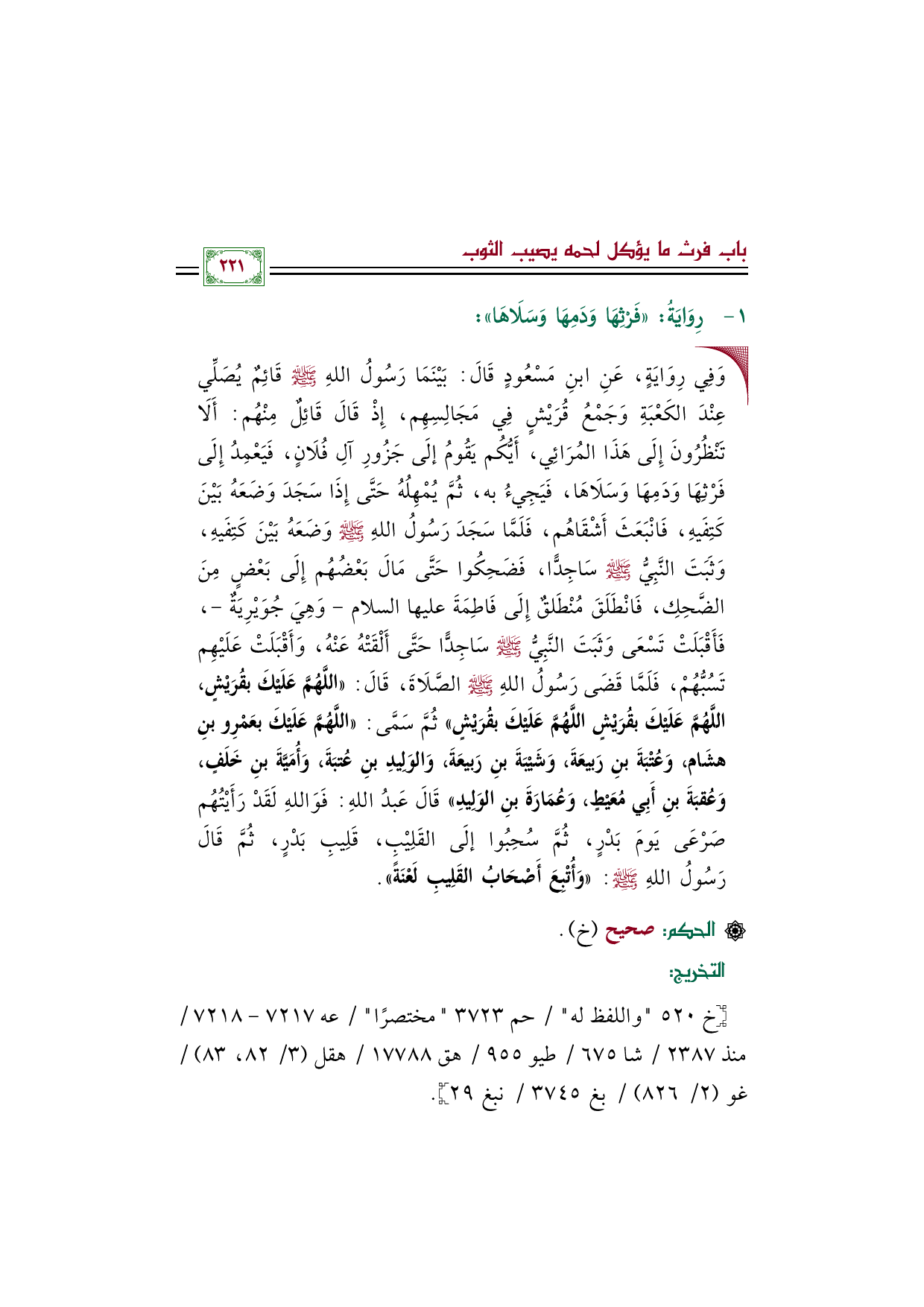 • وَفِي رِوَايَةٍ، عَنِ ابنِ مَسْعُودٍ قَالَ: بَيْنَمَا رَسُولُ اللهِ صلى الله عليه وسلم قَائِمٌ يُصَلِّي عِنْدَ الكَعْبَةِ وَجَمْعُ قُرَيْشٍ فِي مَجَالِسِهِم، إِذْ قَالَ قَائِلٌ مِنْهُم: أَلَا تَنْظُرُونَ إِلَى هَذَا المُرَائِي، أَيُّكُم يَقُومُ إلَى جَزُورِ آلِ فُلَانٍ، فَيَعْمِدُ إِلَى فَرْثِهَا وَدَمِهَا وَسَلَاهَا، فَيَجِيءُ به، ثُمَّ يُمْهِلُهُ حَتَّى إِذَا سَجَدَ وَضَعَهُ بَيْنَ كَتِفَيهِ، فَانْبَعَثَ أَشْقَاهُم، فَلَمَّا سَجَدَ رَسُولُ اللهِ صلى الله عليه وسلم وَضَعَهُ بَيْنَ كَتِفَيهِ، وَثَبَتَ النَّبِيُّ صلى الله عليه وسلم سَاجِدًّا، فَضَحِكُوا حَتَّى مَالَ بَعْضُهُم إِلَى بَعْضٍ مِنَ الضَّحِكِ، فَانْطَلَقَ مُنْطَلقٌ إِلَى فَاطِمَةَ عليها السلام - وَهِيَ جُوَيْرِيَةٌ -، فَأَقْبَلَتْ تَسْعَى وَثَبَتَ النَّبِيُّ صلى الله عليه وسلم سَاجِدًّا حَتَّى أَلْقَتْهُ عَنْهُ، وَأَقْبَلَتْ عَلَيْهِم تَسُبُّهُمْ، فَلَمَّا قَضَى رَسُولُ اللهِ صلى الله عليه وسلم الصَّلَاةَ، قَالَ: ((اللَّهُمَّ عَلَيْكَ بقُرَيْشٍ، اللَّهُمَّ عَلَيْكَ بقُرَيْشٍ اللَّهُمَّ عَلَيْكَ بقُرَيْشٍ)) ثُمَّ سَمَّى: ((اللَّهُمَّ عَلَيْكَ بعَمْرِو بنِ هشَام، وَعُتْبَةَ بنِ رَبيعَةَ، وَشَيْبَةَ بنِ رَبيعَةَ، وَالوَلِيدِ بنِ عُتبَةَ، وَأُمَيَّةَ بنِ خَلَفٍ، وَعُقبَةَ بنِ أَبِي مُعَيْطٍ، وَعُمَارَةَ بنِ الوَلِيدِ)) قَالَ عَبدُ اللهِ: فَوَاللهِ لَقَدْ رَأَيْتُهُم صَرْعَى يَومَ بَدْرٍ، ثُمَّ سُحِبُوا إلَى القَلِيْبِ، قَلِيبِ بَدْرٍ، ثُمَّ قَالَ رَسُولُ اللهِ صلى الله عليه وسلم: ((وَأُتْبِعَ أَصْحَابُ القَلِيبِ لَعْنَةً)).