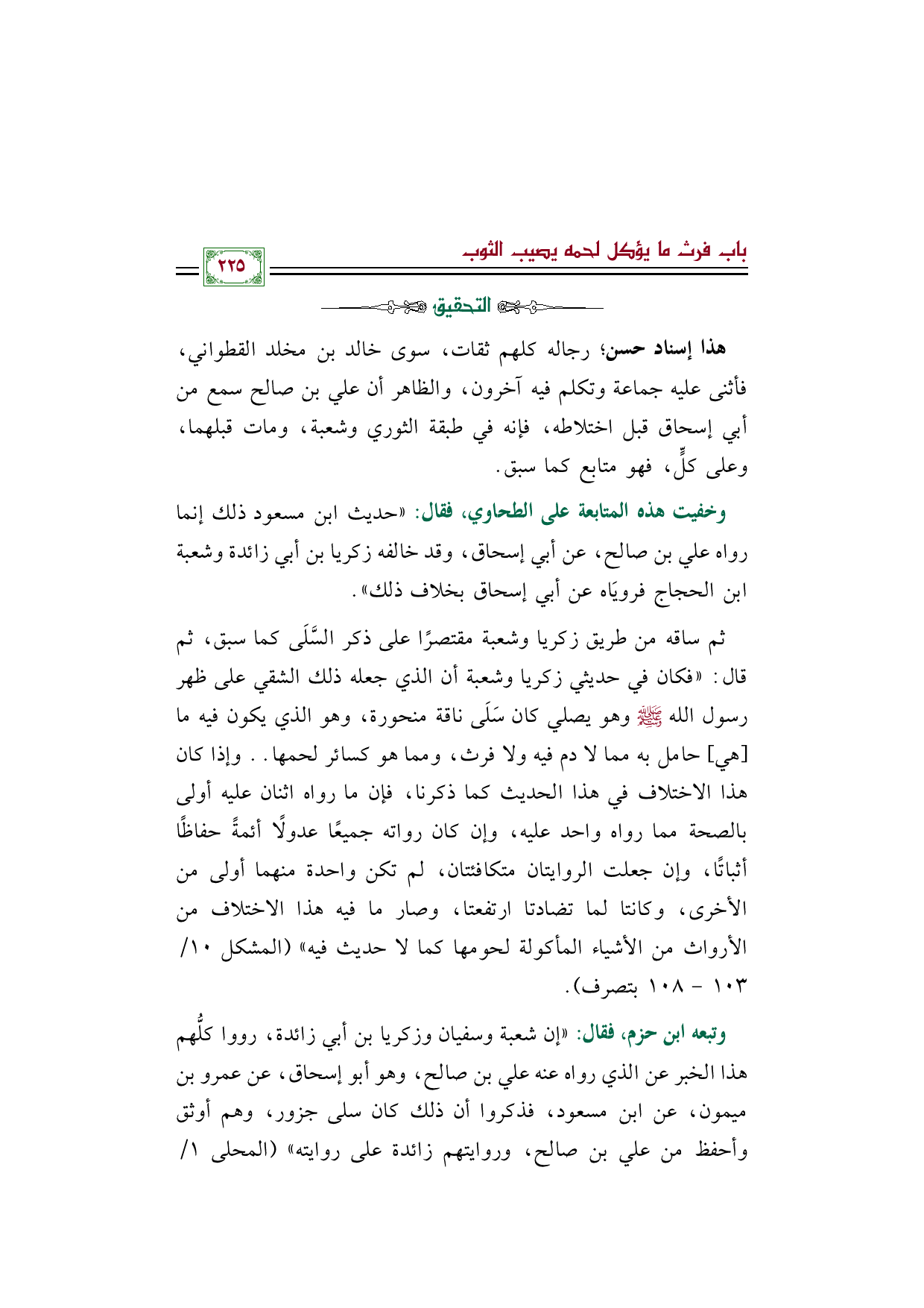 وخفيت هذه المتابعة على الطحاوي، فقال: ((حديث ابن مسعود ذلك إنما رواه علي بن صالح، عن أبي إسحاق، وقد خالفه زكريا بن أبي زائدة وشعبة بن الحجاج فرويَاه عن أبي إسحاق بخلاف ذلك)).