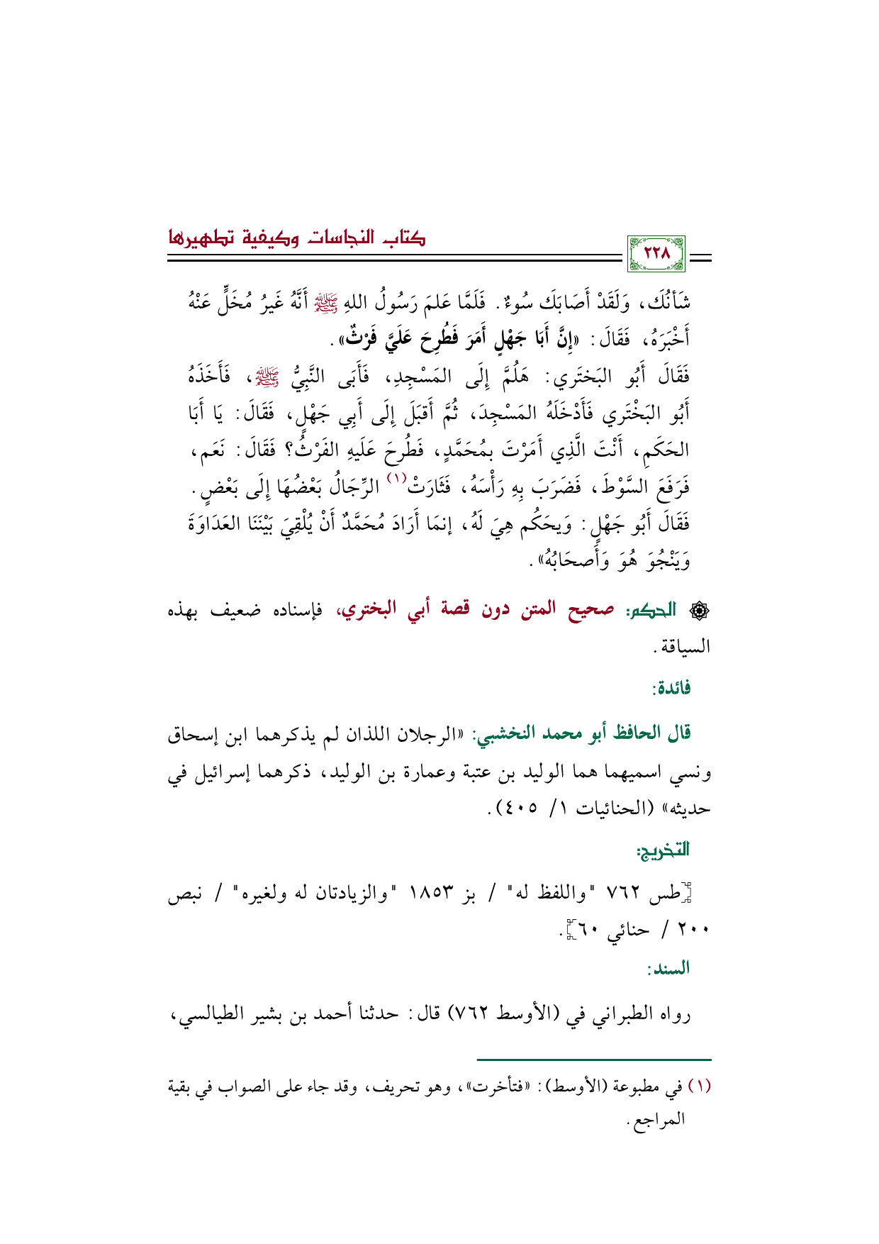 رواه الطبراني في (الأوسط ٧٦٢) قال: حدثنا أحمد بن بشير الطيالسي،