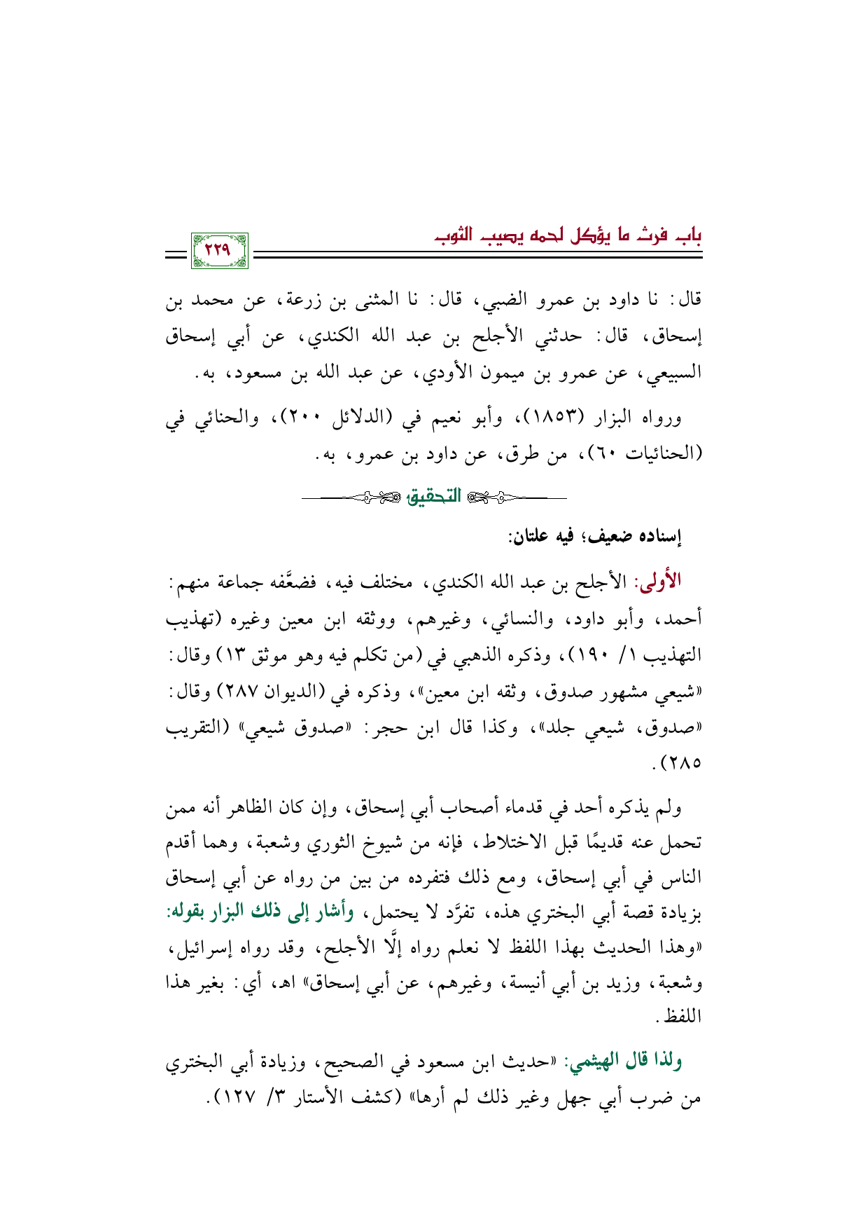 ولم يذكره أحد في قدماء أصحاب أبي إسحاق، وإن كان الظاهر أنه ممن تحمل عنه قديمًا قبل الاختلاط، فإنه من شيوخ الثوري وشعبة، وهما أقدم الناس في أبي إسحاق، ومع ذلك فتفرده من بين من رواه عن أبي إسحاق بزيادة قصة أبي البختري هذه، تفرَّد لا يحتمل، وأشار إلى ذلك البزار بقوله: ((وهذا الحديث بهذا اللفظ لا نعلم رواه إلَّا الأجلح، وقد رواه إسرائيل، وشعبة، وزيد بن أبي أنيسة، وغيرهم، عن أبي إسحاق)) اهـ، أي: بغير هذا اللفظ.