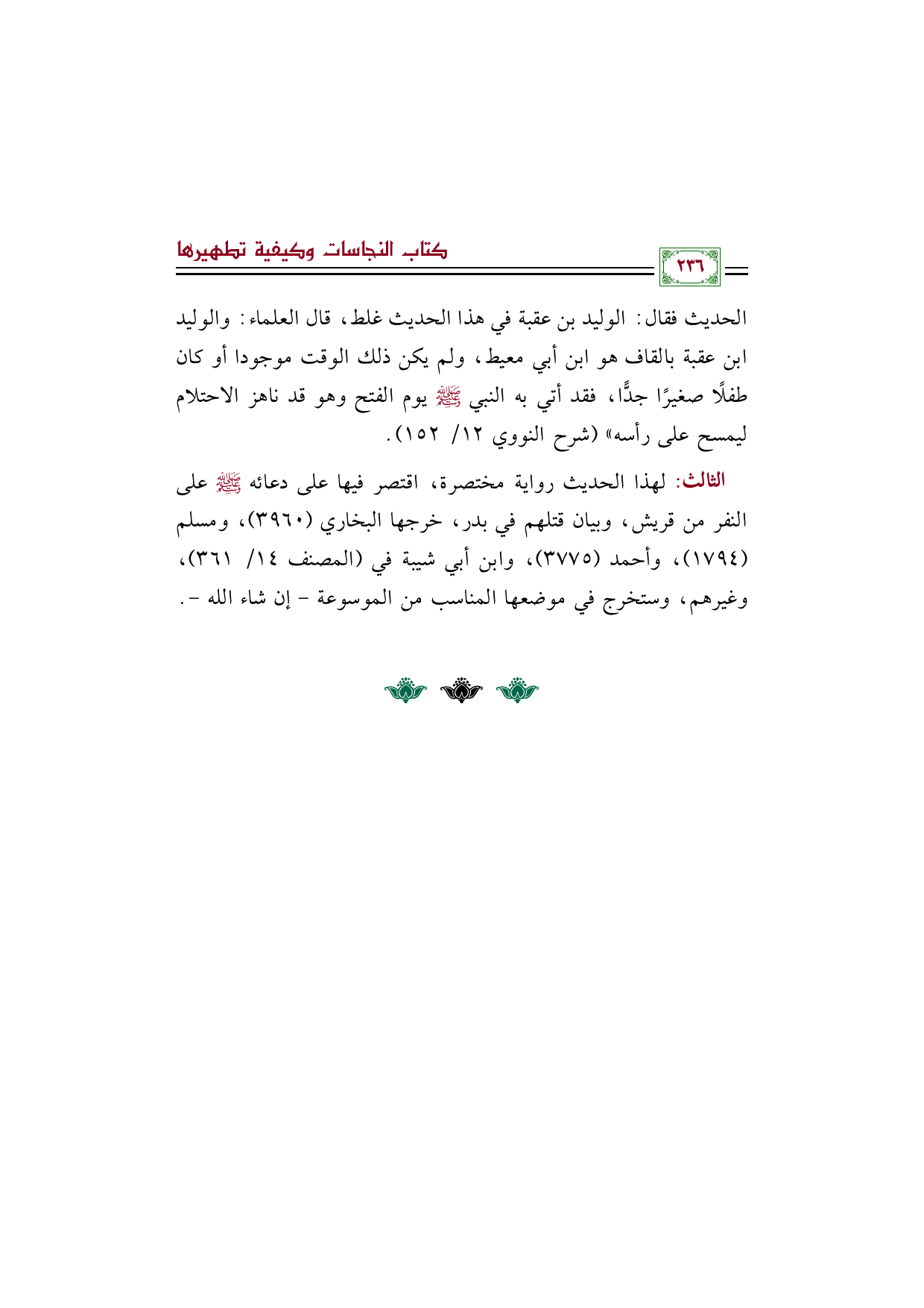 الحديث فقال: الوليد بن عقبة في هذا الحديث غلط، قال العلماء: والوليد بن عقبة بالقاف هو ابن أبي معيط، ولم يكن ذلك الوقت موجودا أو كان طفلًا صغيرًا جدًّا، فقد أتي به النبي صلى الله عليه وسلم يوم الفتح وهو قد ناهز الاحتلام ليمسح على رأسه)) (شرح النووي ١٢/ ١٥٢).