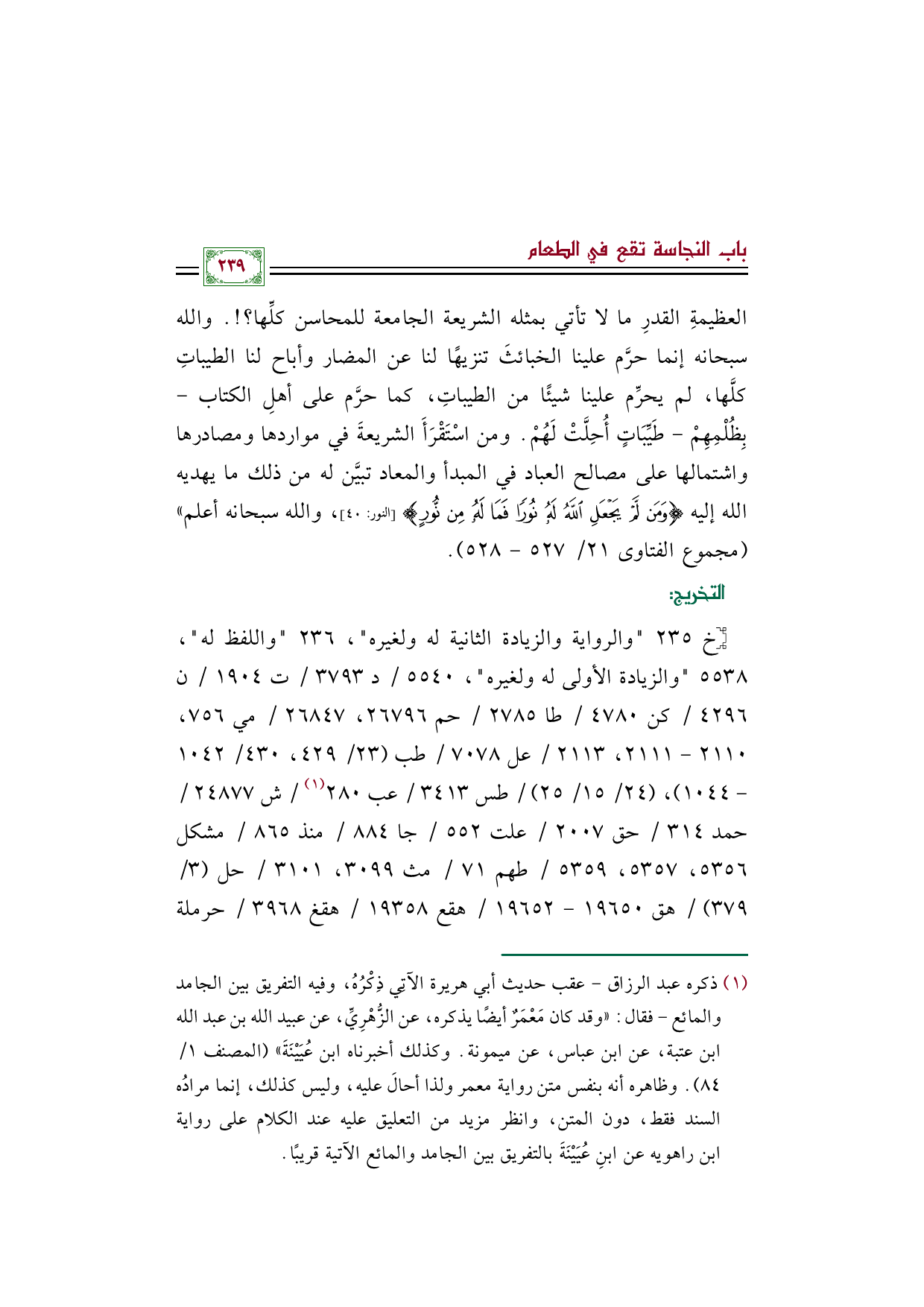 العظيمةِ القدرِ ما لا تأتي بمثله الشريعة الجامعة للمحاسن كلِّها؟ ! . والله سبحانه إنما حرَّم علينا الخبائثَ تنزيهًا لنا عن المضار وأباح لنا الطيباتِ كلَّها، لم يحرِّم علينا شيئًا من الطيباتِ، كما حرَّم على أهلِ الكتاب - بِظُلْمِهِمْ - طَيِّبَاتٍ أُحِلَّتْ لَهُمْ. ومن اسْتَقْرَأَ الشريعةَ في مواردها ومصادرها واشتمالها على مصالح العباد في المبدأ والمعاد تبيَّن له من ذلك ما يهديه الله إليه {وَمَنْ لَمْ يَجْعَلِ اللَّهُ لَهُ نُورًا فَمَا لَهُ مِنْ نُورٍ} (النور-٤٠)، والله سبحانه أعلم)) (مجموع الفتاوى ٢١/ ٥٢٧ - ٥٢٨).