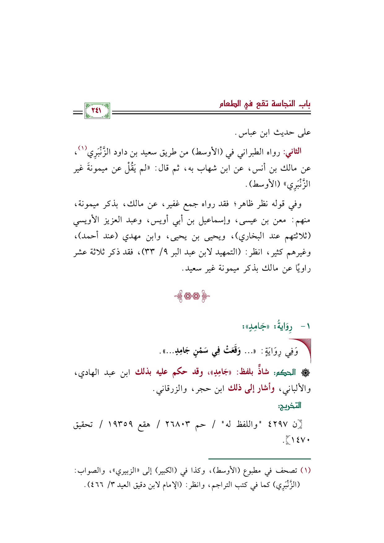 الثاني: رواه الطبراني في (الأوسط) من طريق سعيد بن داود الزَّنْبَرِي (¬١)، عن مالك بن أنس، عن ابن شهاب به، ثم قال: ((لم يَقُلْ عن ميمونةَ غير الزَّنْبَرِي)) (الأوسط).