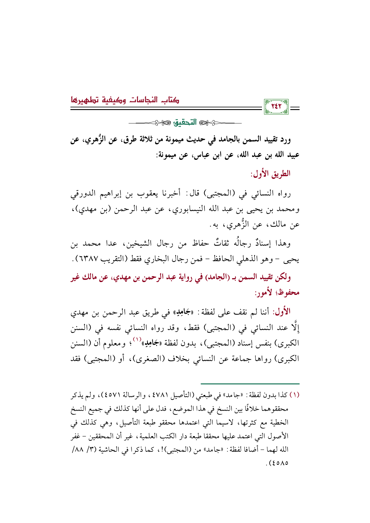 الأول: أننا لم نقف على لفظة: ((جَامِدٍ)) في طريق عبد الرحمن بن مهدي إِلَّا عند النسائي في (المجتبى) فقط، وقد رواه النسائي نفسه في (السنن الكبرى) بنفس إسناد (المجتبى)، بدون لفظة ((جَامِدٍ)) (¬١)؛ ومعلوم أن (السنن الكبرى) رواها جماعة عن النسائي بخلاف ((الصغرى))، أو (المجتبى) فقد