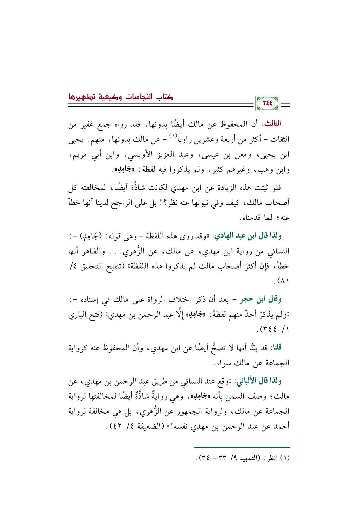 الثالث: أن المحفوظ عن مالك أيضًا بدونها، فقد رواه جمع غفير من الثقات -أكثر من أربعة وعشرين راويا (¬١) - عن مالك بدونها، منهم: يحيى بن يحيى، ومعن بن عيسى، وعبد العزيز الأويسي، وابن أبي مريم، وابن وهب، وغيرهم كثير، ولم يذكروا فيه لفظة: ((جَامِدٍ)).
