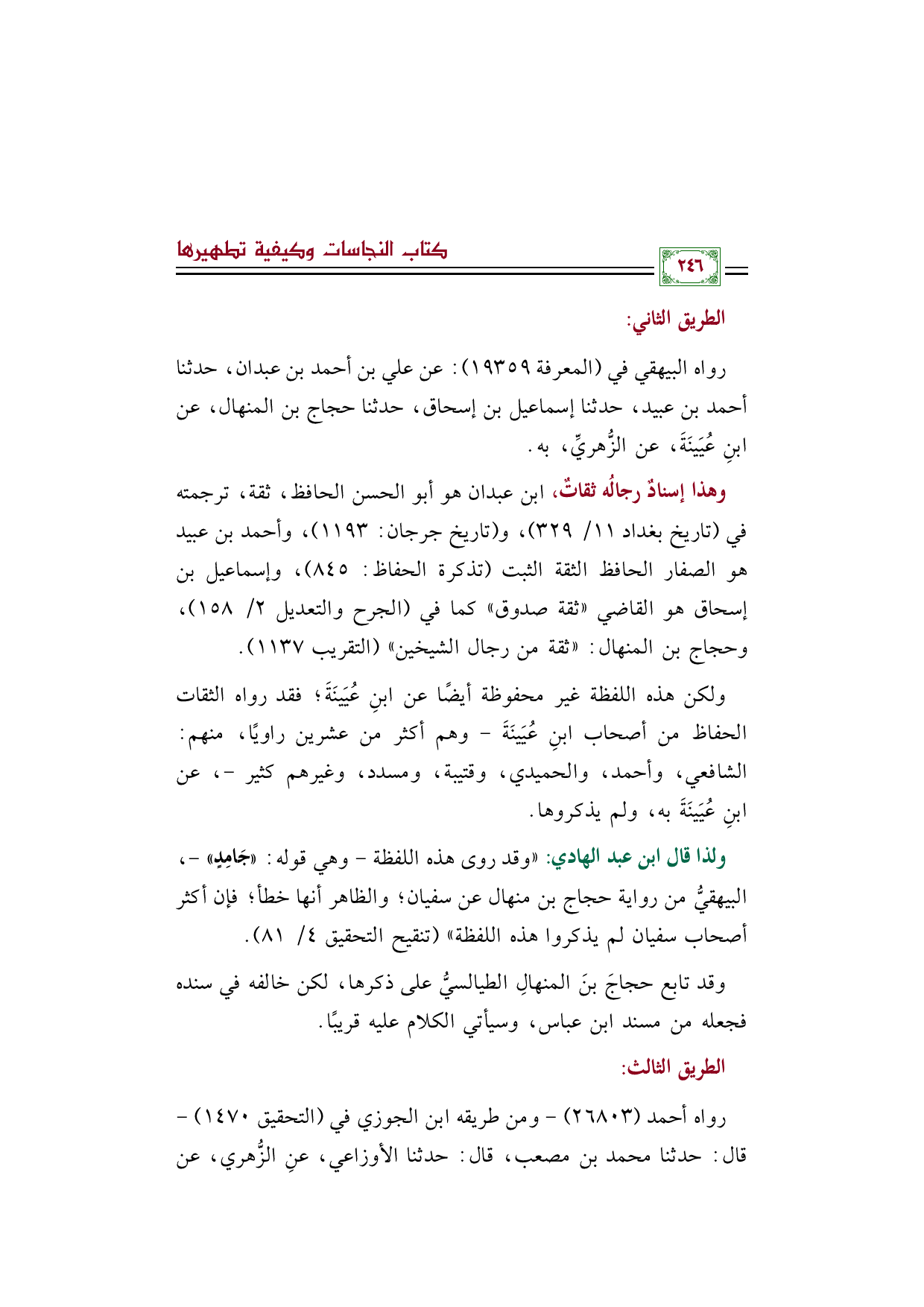 ولذا قال ابن عبد الهادي: ((وقد روى هذه اللفظة -وهي قوله: ((جَامِدٍ)) -، البيهقيُّ من رواية حجاج بن منهال عن سفيان؛ والظاهر أنها خطأ؛ فإن أكثر أصحاب سفيان لم يذكروا هذه اللفظة)) (تنقيح التحقيق ٤/ ٨١).