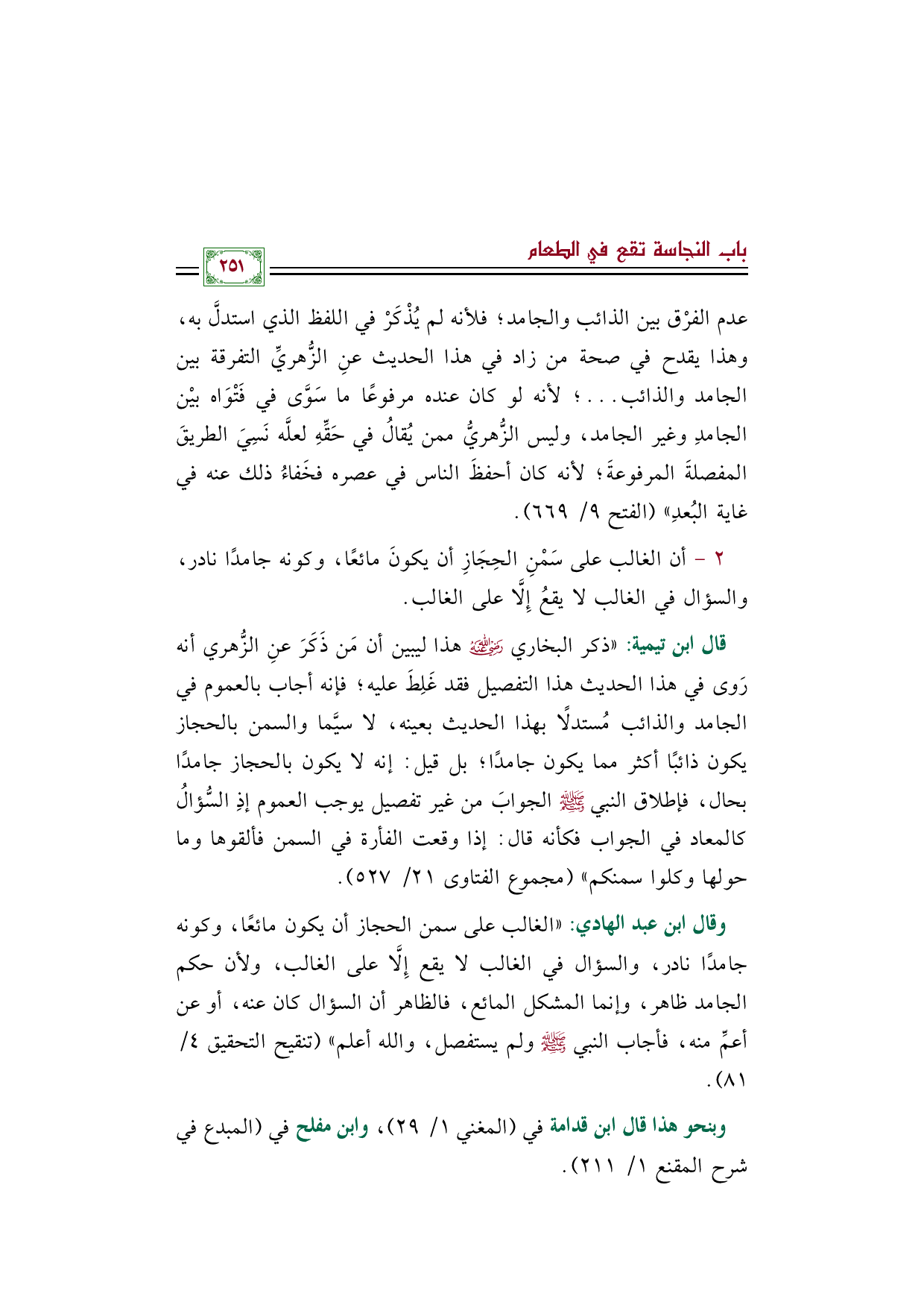 وقال ابن عبد الهادي: ((الغالب على سمن الحجاز أن يكون مائعًا، وكونه جامدًا نادر، والسؤال في الغالب لا يقع إِلَّا على الغالب، ولأن حكم الجامد ظاهر، وإنما المشكل المائع، فالظاهر أن السؤال كان عنه، أو عن أعمِّ منه، فأجاب النبي صلى الله عليه وسلم ولم يستفصل، والله أعلم)) (تنقيح التحقيق ٤/ ٨١).