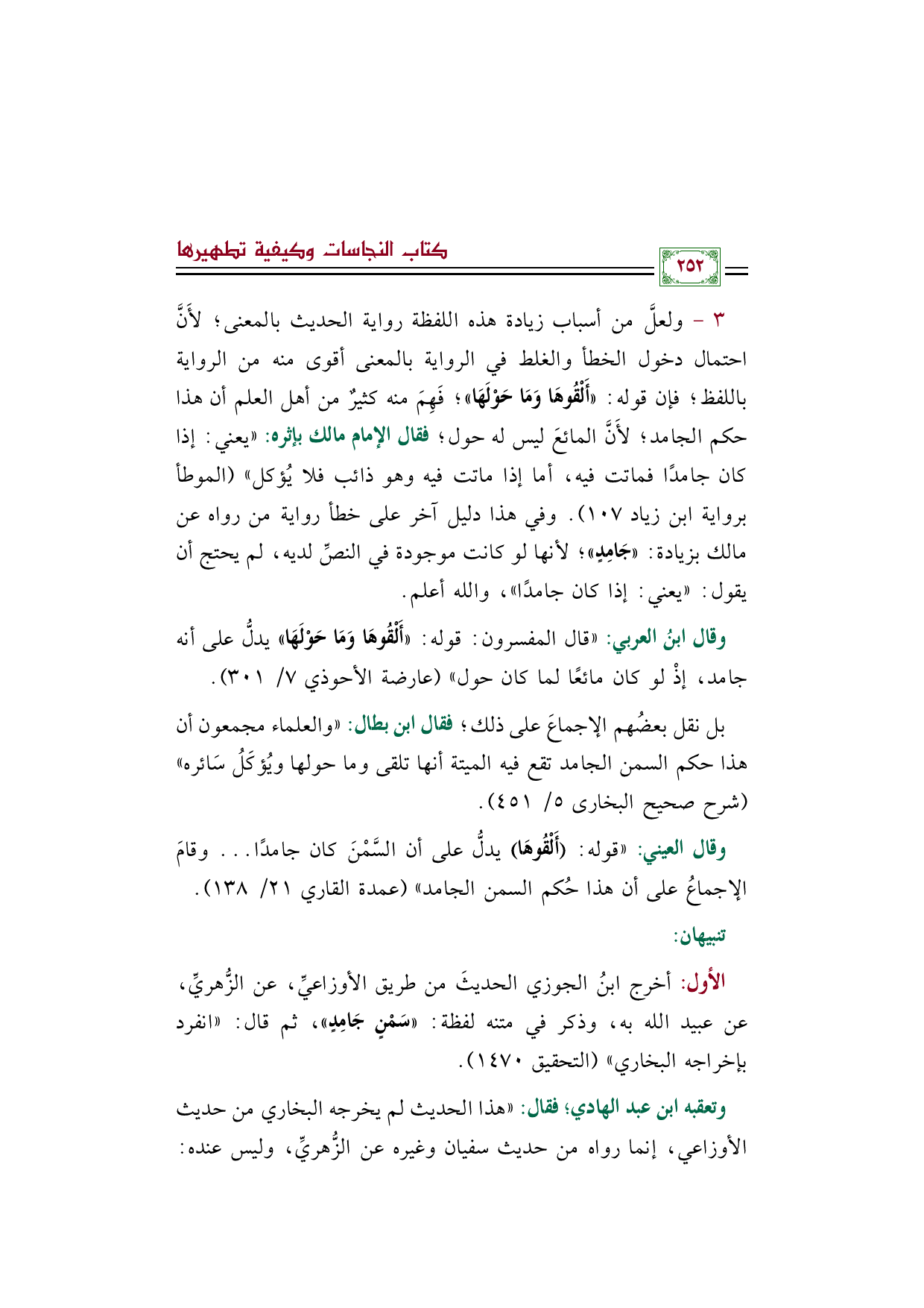 ٣ - ولعلَّ من أسباب زيادة هذه اللفظة رواية الحديث بالمعنى؛ لأَنَّ احتمال دخول الخطأ والغلط في الرواية بالمعنى أقوى منه من الرواية باللفظ؛ فإن قوله: ((أَلْقُوهَا وَمَا حَوْلَهَا))؛ فَهِمَ منه كثيرٌ من أهل العلم أن هذا حكم الجامد؛ لأَنَّ المائعَ ليس له حول؛ فقال الإمام مالك بإثره: ((يعني: إذا كان جامدًا فماتت فيه، أما إذا ماتت فيه وهو ذائب فلا يُؤكل)) (الموطأ برواية ابن زياد ١٠٧). وفي هذا دليل آخر على خطأ رواية من رواه عن مالك بزيادة: ((جَامِدٍ))؛ لأنها لو كانت موجودة في النصِّ لديه، لم يحتج أن يقول: ((يعني: إذا كان جامدًا))، والله أعلم.