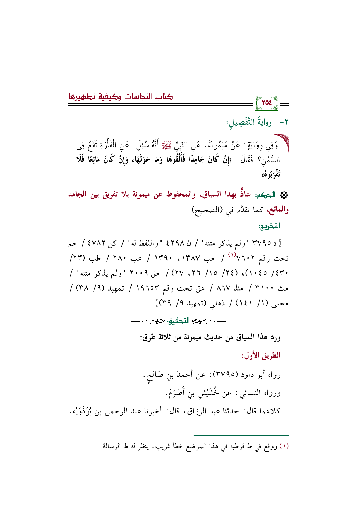 [الحكم]: شاذٌّ بهذا السياق، والمحفوظ عن ميمونة بلا تفريق بين الجامد والمائع، كما تقدَّم في (الصحيح).