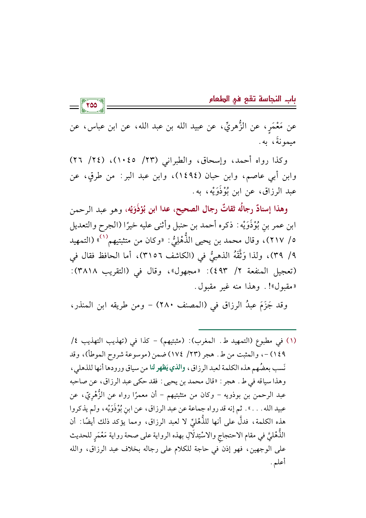 (¬١) في مطبوع (التمهيد ط. المغرب): (مثبتيهم) - كذا في (تهذيب التهذيب ٤/ ١٤٩) -، والمثبت من ط. هجر (٢٣/ ١٧٤) ضمن (موسوعة شروح الموطأ)، وقد نَسب بعضُهم هذه الكلمة لعبد الرزاق، والذي يَظهر لنا من سياق ورودها أنها للذهلي، وهذا سياقه في ط. هجر: ((قال محمد بن يحيى: فقد حكى عبد الرزاق، عن صاحبه عبد الرحمن بن بوذويه -وكان من متثبتيهم- أن معمرًا رواه عن الزُّهْرِيّ، عن عبيد الله ... )). ثم إنه قد رواه جماعة عن عبد الرزاق، عن ابنِ بُوْذَوَيْه، ولم يذكروا هذه الكلمة، فدلَّ على أنها للذُّهْليِّ لا لعبد الرزاق، ومما يؤكد ذلك أيضًا: أن الذُّهْليَّ في مقام الاحتجاجِ والاسْتِدلَالِ بهذه الرواية على صحة رواية مَعْمَرٍ للحديث على الوجهين، فهو إذن في حاجة للكلام على رجاله بخلاف عبد الرزاق، والله أعلم.