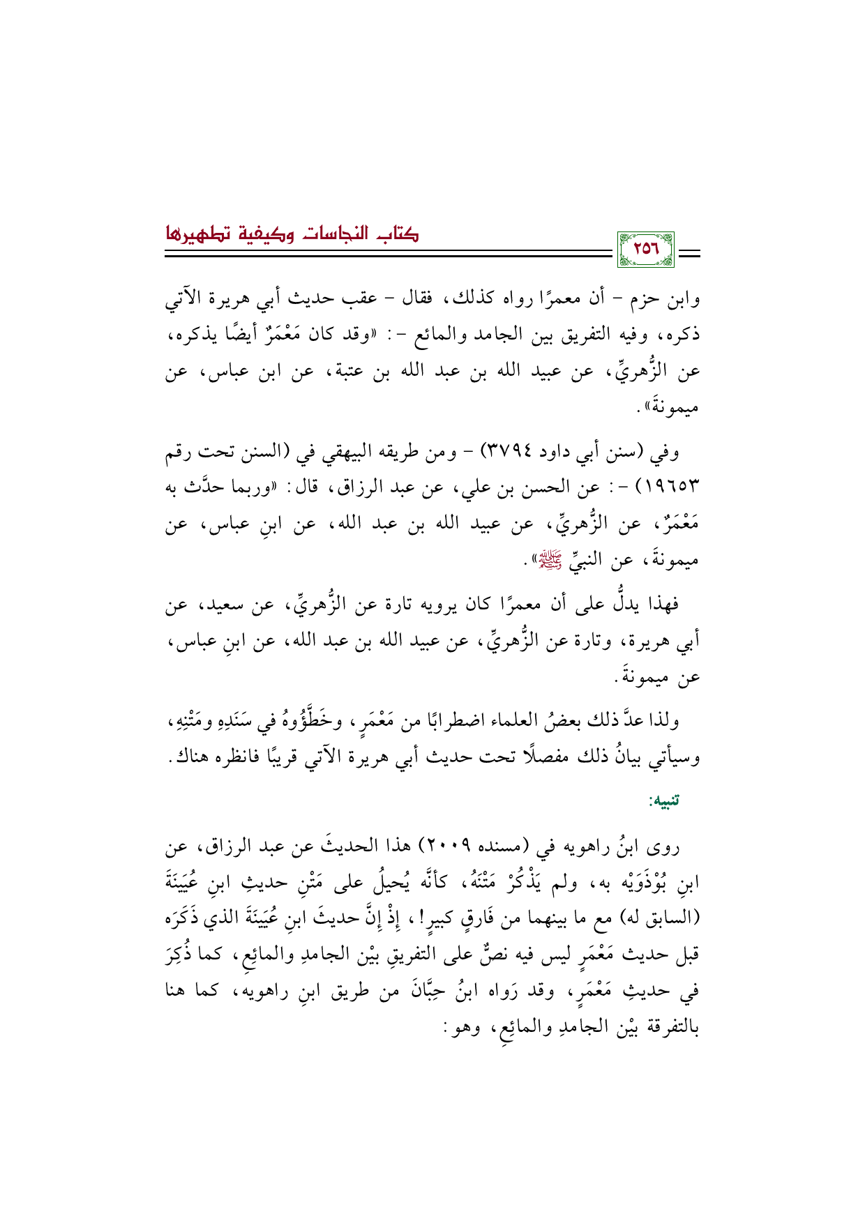 روى ابنُ راهويه في (مسنده ٢٠٠٩) هذا الحديثَ عن عبد الرزاق، عن ابنِ بُوْذَوَيْه به، ولم يَذْكُرْ مَتْنَهُ، كأنَّه يُحيلُ على مَتْنِ حديثِ ابنِ عُيَينَةَ (السابق له) مع ما بينهما من فَارقٍ كبيرٍ! ، إِذْ إِنَّ حديثَ ابنِ عُيَينَةَ الذي ذَكَرَه قبل حديث مَعْمَرٍ ليس فيه نصٌّ على التفريقِ بيْن الجامدِ والمائِعِ، كما ذُكِرَ في حديثِ مَعْمَرٍ، وقد رَواه ابنُ حِبَّانَ من طريق ابنِ راهويه، كما هنا بالتفرقة بيْن الجامدِ والمائِعِ، وهو:
