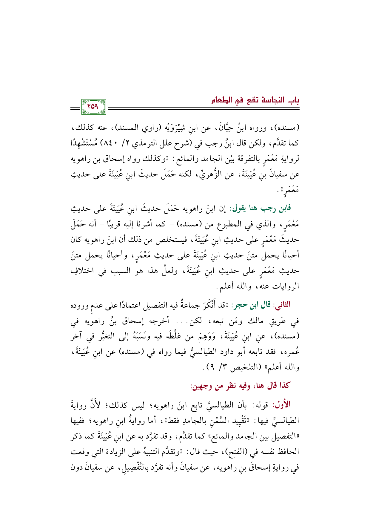 الأول: قوله: بأن الطيالسيَّ تابع ابنَ راهويه؛ ليس كذلك؛ لأَنَّ روايةَ الطيالسيِّ فيها: ((تَقْيِيد السَّمْنِ بالجامدِ فقط))، أما روايةُ ابنِ راهويه؛ ففيها ((التفصيل بين الجامد والمائع)) كما تقدَّم، وقد تفرَّد به عن ابنِ عُيَينَةَ كما ذكر الحافظ نفسه في ((الفتح))، حيث قال: ((وتقدَّم التنبيهُ على الزيادة التي وقعت في روايةِ إسحاقَ بنِ راهويه، عن سفيانَ وأنه تفرَّد بالتَّفْصِيلِ، عن سفيانَ دون