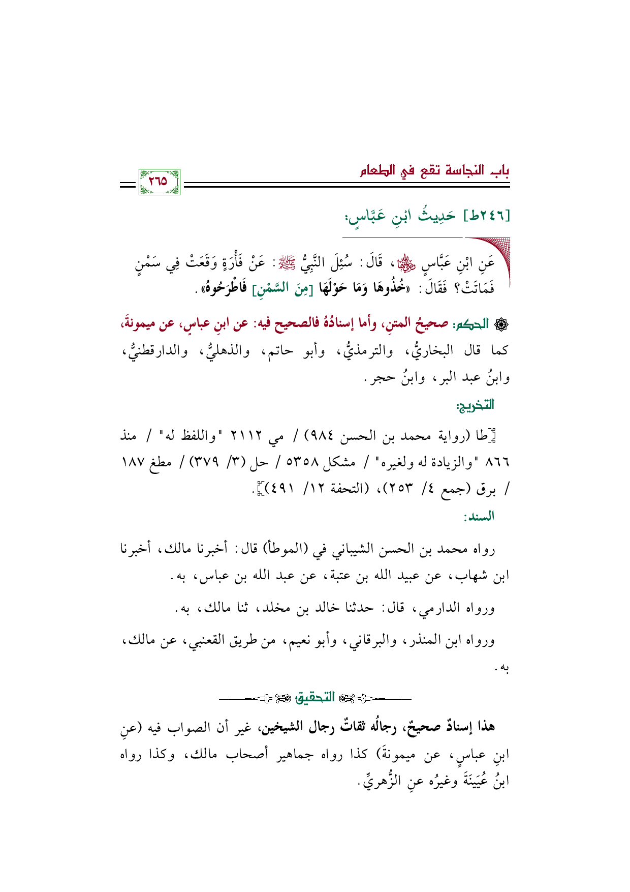 ◼ عَنِ ابْنِ عَبَّاسٍ رضي الله عنهما، قَالَ: سُئِلَ النَّبِيُّ صلى الله عليه وسلم: عَنْ فَأْرَةٍ وَقَعَتْ فِي سَمْنٍ فَمَاتَتْ؟ فَقَالَ: ((خُذُوهَا وَمَا حَوْلَهَا [مِنَ السَّمْنِ] فَاطْرَحُوهُ)).