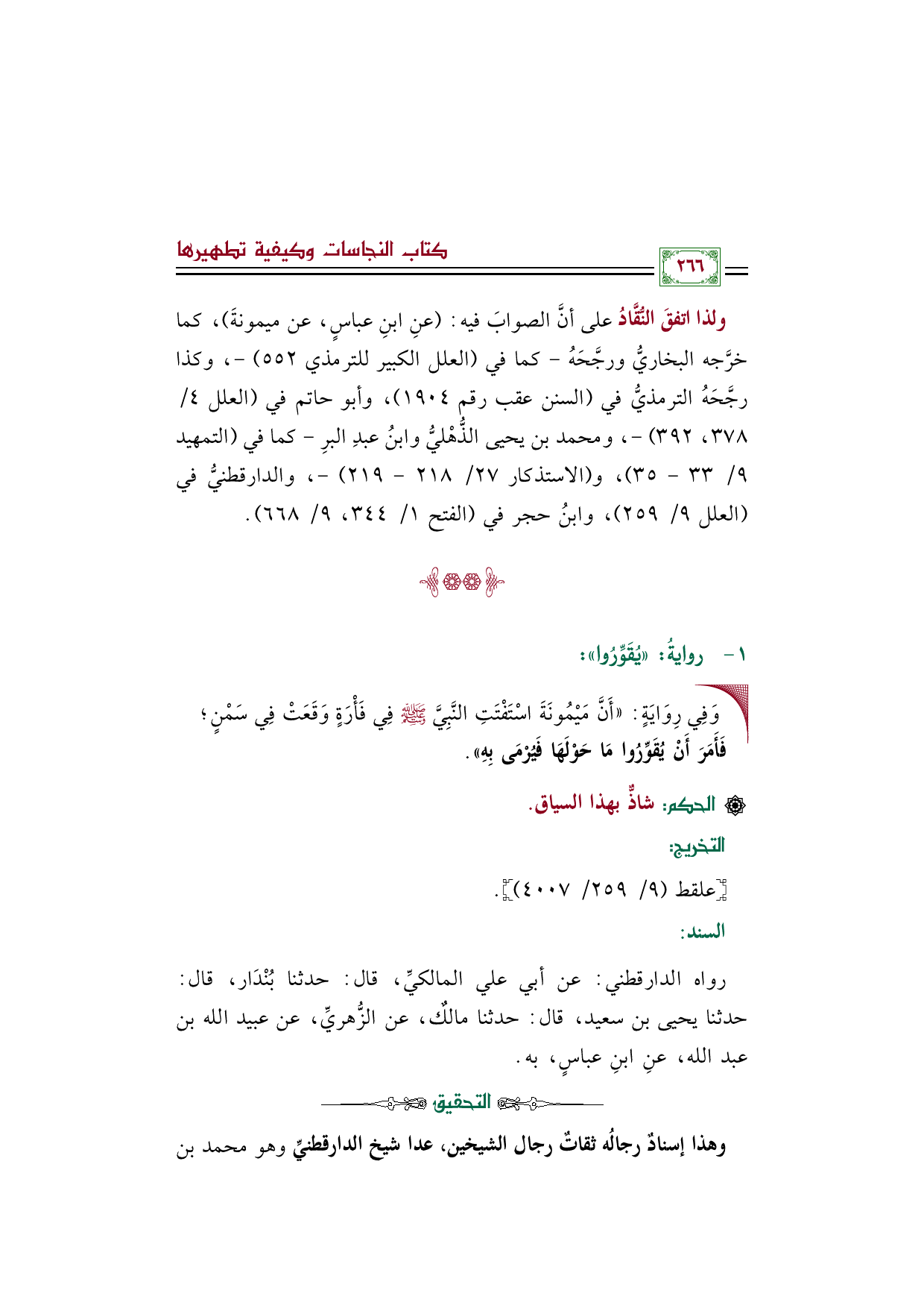ولذا اتفقَ النُّقَّادُ على أنَّ الصوابَ فيه: (عنِ ابنِ عباسٍ، عن ميمونةَ)، كما خرَّجه البخاريُّ ورجَّحَهُ - كما في (العلل الكبير للترمذي ٥٥٢) -، وكذا رجَّحَهُ الترمذيُّ في (السنن عقب رقم ١٩٠٤)، وأبو حاتم في (العلل ٤/ ٣٧٨، ٣٩٢) -، ومحمد بن يحيى الذُّهْليُّ وابنُ عبدِ البرِ -كما في (التمهيد ٩/ ٣٣ - ٣٥)، و (الاستذكار ٢٧/ ٢١٨ - ٢١٩) -، والدارقطنيُّ في (العلل ٩/ ٢٥٩)، وابنُ حجر في (الفتح ١/ ٣٤٤، ٩/ ٦٦٨).