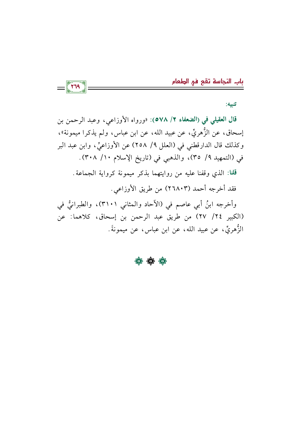 قال العقيلي في (الضعفاء ٢/ ٥٧٨): ((ورواه الأوزاعي، وعبد الرحمن بن إسحاق، عن الزُّهريِّ، عن عبيد الله، عن ابن عباس، ولم يذكرا ميمونة))، وكذلك قال الدارقطني في (العلل ٩/ ٢٥٨) عن الأوزاعيِّ، وابن عبد البر في (التمهيد ٩/ ٣٥)، والذهبي في (تاريخ الإسلام ١٠/ ٣٠٨).
