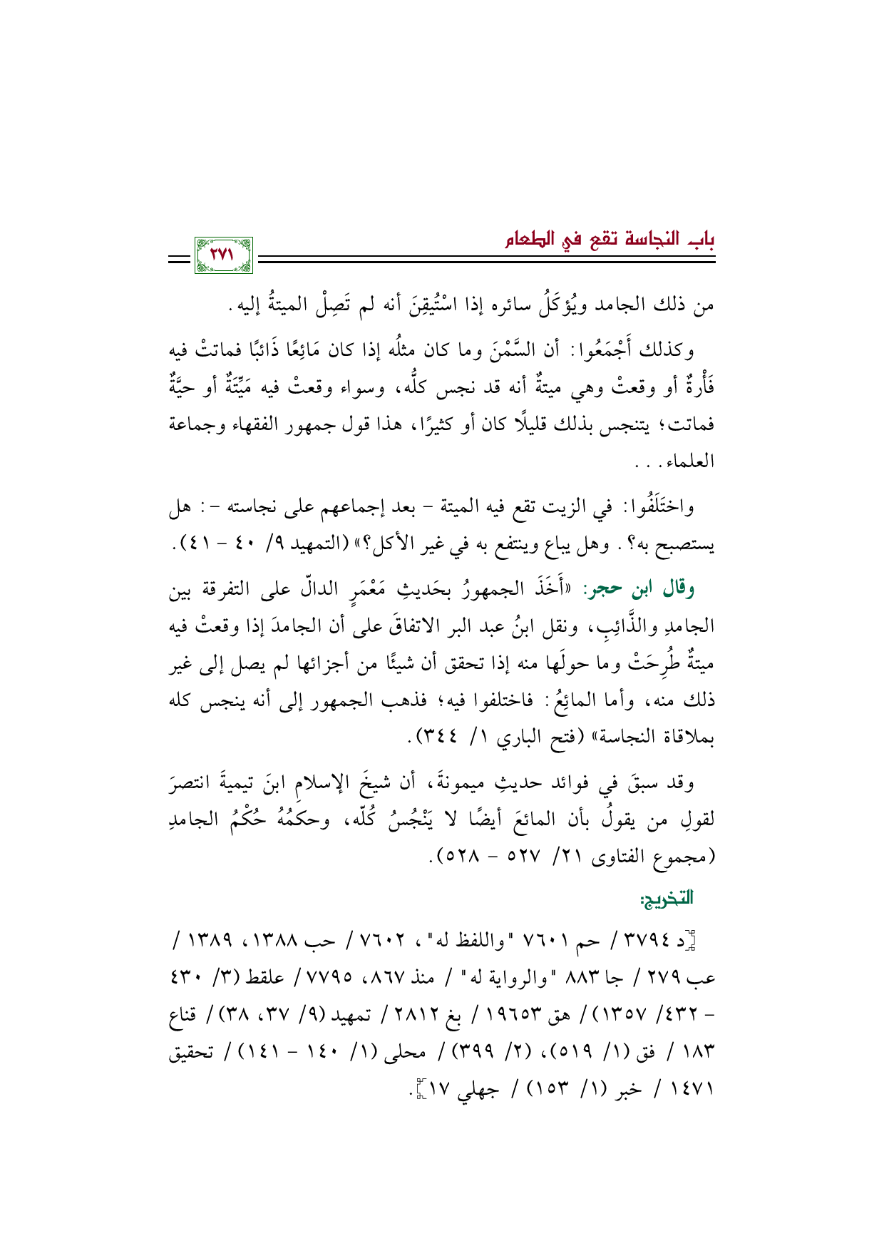 وقال ابن حجر: ((أَخَذَ الجمهورُ بحَديثِ مَعْمَرٍ الدالّ على التفرقة بين الجامدِ والذَّائِبِ، ونقل ابنُ عبد البر الاتفاقَ على أن الجامدَ إذا وقعتْ فيه ميتةٌ طُرِحَتْ وما حولَها منه إذا تحقق أن شيئًا من أجزائها لم يصل إلى غير ذلك منه، وأما المائِعُ: فاختلفوا فيه؛ فذهب الجمهور إلى أنه ينجس كله بملاقاة النجاسة)) (فتح الباري ١/ ٣٤٤).