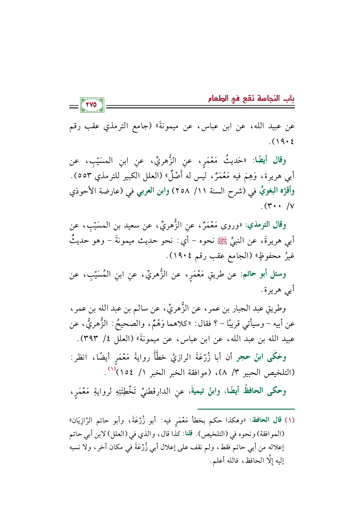(¬١) قال الحافظ: ((وهكذا حكم بخطأ مَعْمَرٍ فيه: أبو زُرْعَةَ، وأبو حاتم الرَّازِيَان)) (الموافقة) ونحوه في (التلخيص). قلنا: كذا قال، والذي في (العلل) لابن أبي حاتم إعلاله من أبي حاتم فقط، ولم نقف على إعلال أبي زُرْعَةَ في مكان آخر، ولا نسبه إليه إِلَّا الحافظ، فالله أعلم.