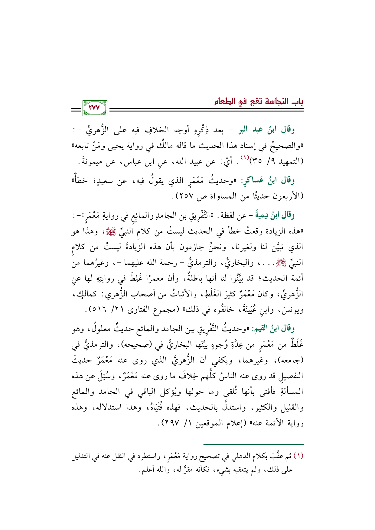 وقال ابنُ تيميةَ -عن لفظة: ((التَّفْرِيقِ بن الجامدِ والمائِعِ في روايةِ مَعْمَرٍ)) -: ((هذه الزيادة وقعتْ خطأ في الحديث ليستْ من كلامِ النبيِّ صلى الله عليه وسلم، وهذا هو الذي تبيَّن لنا ولغيرنا، ونحنُ جازمون بأن هذه الزيادةَ ليستْ من كلامِ النبيِّ صلى الله عليه وسلم ... ، والبخاريُّ، والترمذيُّ -رحمة الله عليهما-، وغيرُهما من أئمة الحديث؛ قد بيَّنُوا لنا أنها باطلةٌ، وأن معمرًا غَلِطَ في روايتِهِ لها عنِ الزُّهريِّ، وكان مَعْمَرٌ كثيرَ الغَلَطِ، والأثباتُ من أصحاب الزُّهري: كمالكٍ، ويونسَ، وابنِ عُيَينَةَ، خالفُوه في ذلك)) (مجموع الفتاوى ٢١/ ٥١٦).