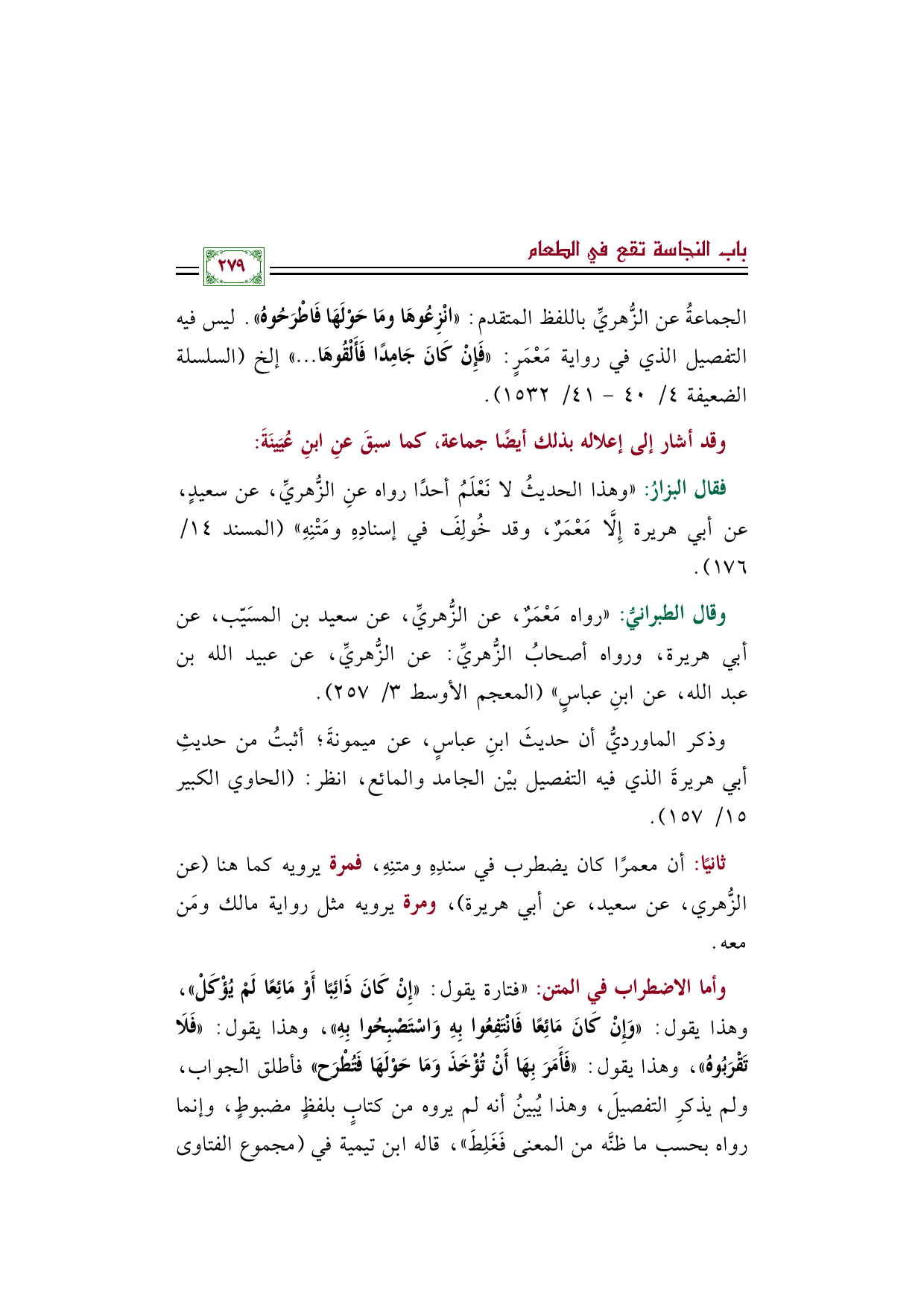الجماعةُ عن الزُّهريِّ باللفظ المتقدم: ((انْزِعُوهَا ومَا حَوْلَهَا فَاطْرَحُوهُ)). ليس فيه التفصيل الذي في رواية مَعْمَرٍ: ((فَإِنْ كَانَ جَامِدًا فَأَلْقُوهَا ... إلخ)) (السلسلة الضعيفة ٤/ ٤٠ - ٤١/ ١٥٣٢).